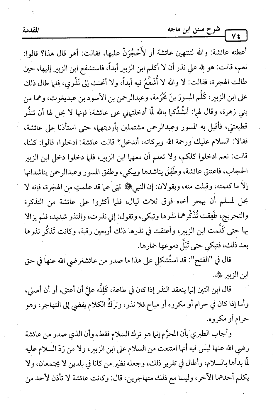 أعطته عائشة: والله لتنتهين عائشة أو لأَحْجُرَنّ عليها، فقالت: أهو قال هذا؟ قالوا: نعم، قالت: هو لله علي نذر أن لا أكلم ابن الزبير أبدًا، فاستشفع ابن الزبير إليها، حين طالت الهجرة، فقالت: لا والله لا أُشَفِّعُ فيه أبدًا، ولا أتحنث إلى نَذْري، فلما طال ذلك على ابن الزبير، كَلَّم المسورَ بنَ مَخْرَمة، وعبد الرحمن بن الأسود بن عبد يغوث، وهما من بني زهرة، وقال لهما: أنشُدُكما بالله لمّا أدخلتماني على عائشة، فإنها لا يحل لها أن تنذُر قطيعتي، فأقبل به المسور وعبد الرحمن مشتملين بأرديتهما، حتى استأذنا على عائشة، فقالا: السلام عليك ورحمة الله وبركاته، أندخل؟ قالت عائشة: ادخلوا، قالوا: كلنا، قالت: نعم ادخلوا كلكم، ولا تعلم أن معهما ابن الزبير، فلما دخلوا دخل ابن الزبير الحجاب، فاعتنق عائشة، وطَفِقَ يناشدها ويبكي، وطفق المسور وعبد الرحمن يناشدانها إلا ما كلمته، وقبلت منه، ويقولان: إن النبي -صلى الله عليه وسلم- نَهَى عما قد علمتِ من الهجرة، فإنه لا يحل لمسلم أن يهجر أخاه فوق ثلاث ليال، فلما أكثروا على عائشة من التذكرة والتحريج، طَفِقت تُذَكِّرهما نذرها وتبكي، وتقول: إني نذرت، والنذر شديد، فلم يزالا بها حتى كَلَّمت ابن الزبير، وأعتقت في نذرها ذلك أربعين رقبة، وكانت تَذكُر نذرها بعد ذلك، فتبكي حتى تَبَلَّ دموعها خمارها.