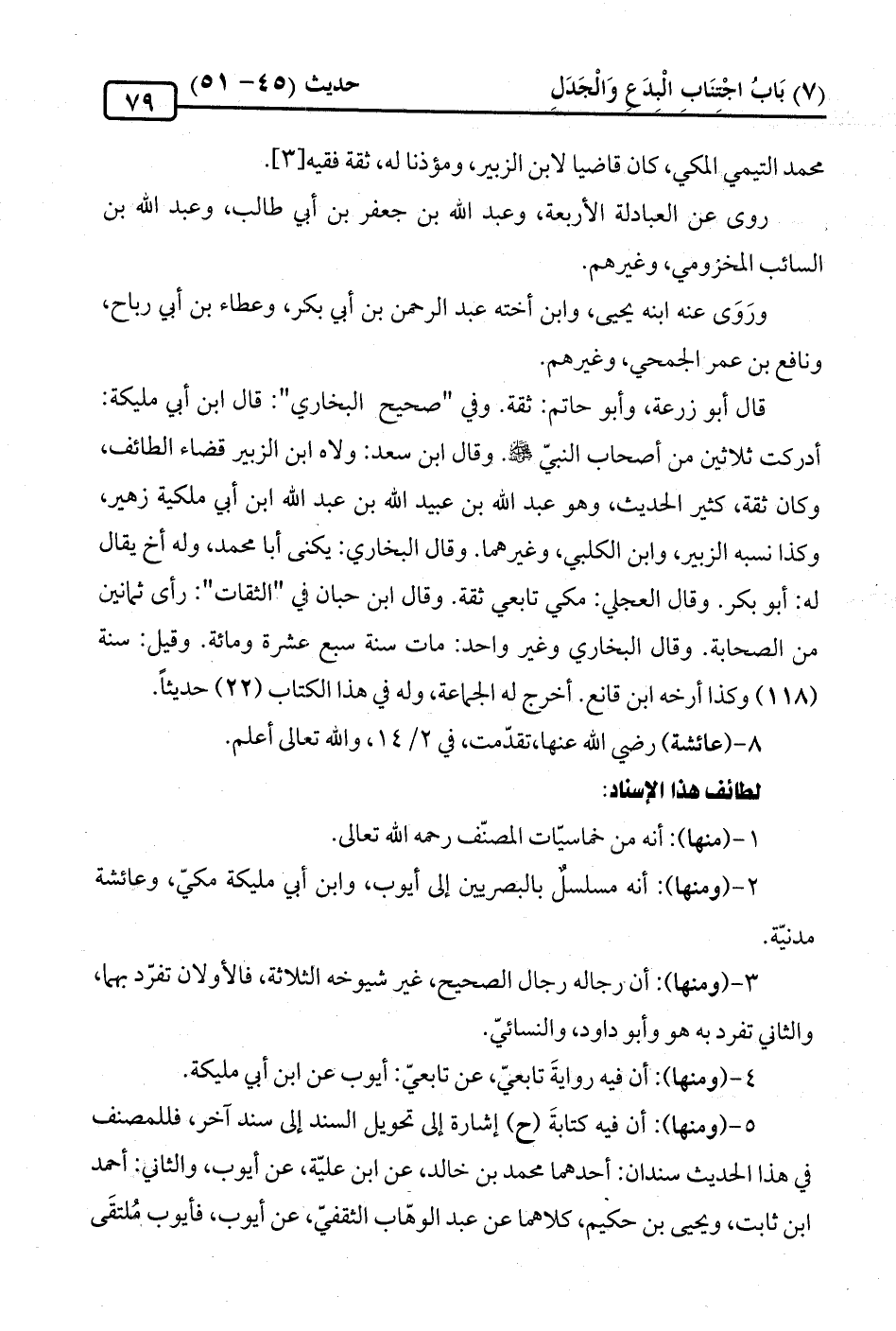 قال أبو زرعة، وأبو حاتم: ثقة. وفي "صحيح البخاري": قال ابن أبي مليكة: أدركت ثلاثين من أصحاب النبيّ -صلى الله عليه وسلم-. وقال ابن سعد: ولاه ابن الزبير قضاء الطائف، وكان ثقة، كثير الحديث، وهو عبد الله بن عبيد الله بن عبد الله ابن أبي ملكية زهير، وكذا نسبه الزبير، وابن الكلبي، وغيرهما. وقال البخاري: يكنى أبا محمد، وله أخ يقال له: أبو بكر. وقال العجلي: مكي تابعيّ ثقة. وقال ابن حبان في "الثقات": رأى ثمانين من الصحابة. وقال البخاري وغير واحد: مات سنة سبع عشرة ومائة. وقيل: سنة (118) وكذا أرخه ابن قانع. أخرج له الجماعة، وله في هذا الكتاب (22) حديثًا.