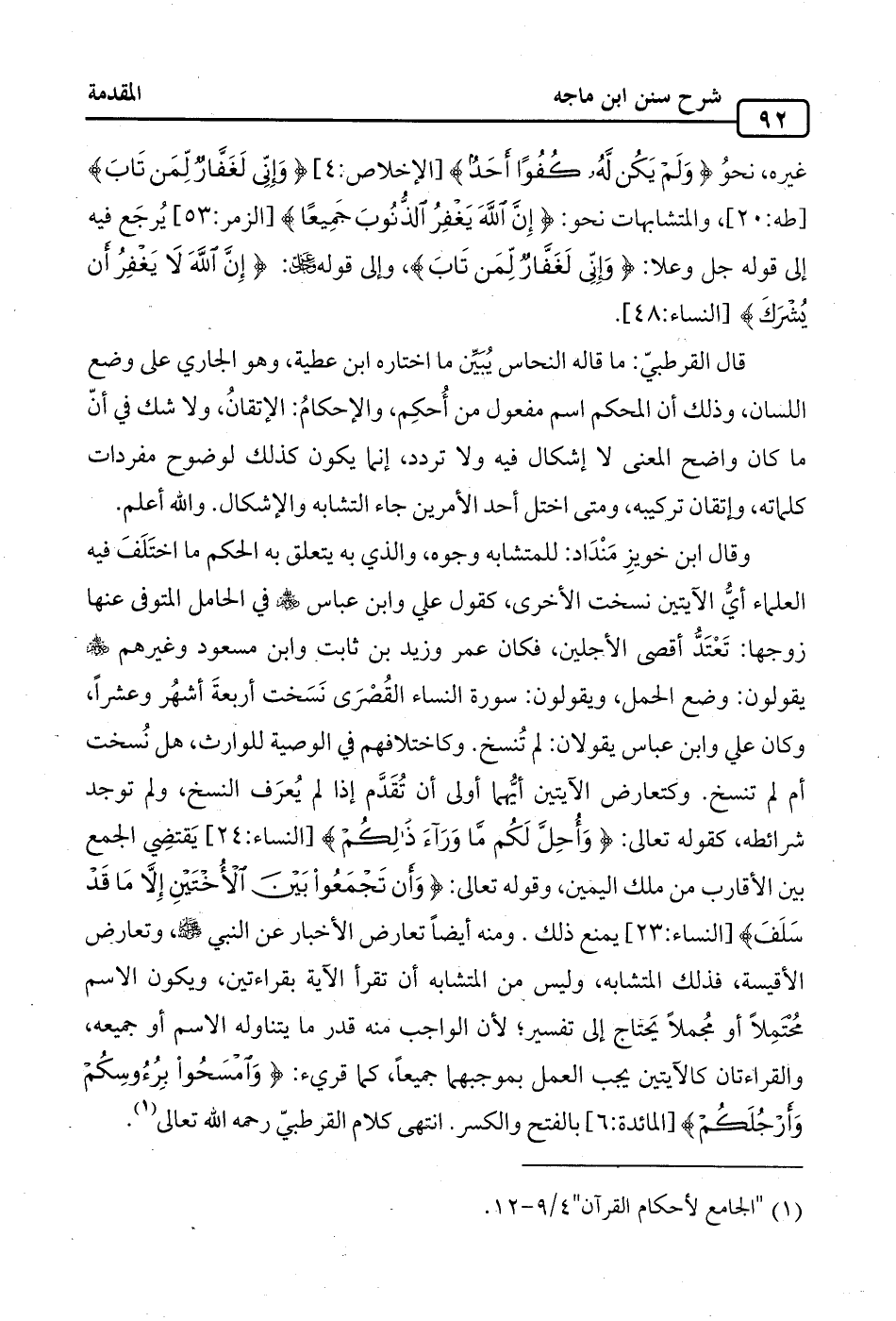وقال ابن خويزِ مَنْدَاد: للمتشابه وجوه، والذي يه يتعلق به الحكم ما اختَلَفَ فيه العلماء أيُّ الآيتين نسخت الأخرى، كقول علي وابن عباس -رضي الله عنهم- في الحامل المتوفى عنها زوجها: تَعْتَدُّ أقصى الأجلين، فكان عمر وزيد بن ثابت وابن مسعود وغيرهم -رضي الله عنهم- يقولون: وضع الحمل، ويقولون: سورة النساء القُصْرَى نَسَخت أربعةَ أشهُر وعشرًا، وكان علي وابن عباس يقولان: لم تُنسخ. وكاختلافهم في الوصية للوارث، هل نُسخت أم لم تنسخ. وكتعارض الآيتين أيُّهما أولى أن تُقَدَّم إذا لم يُعرَف النسخ، ولم توجد شرائطه، كقوله تعالى: {وَأُحِلَّ لَكُمْ مَا وَرَاءَ ذَلِكُمْ} [النساء: 24] يَقتضِي الجمع بين الأقارب من ملك اليمين، وقوله تعالى: {وَأَنْ تَجْمَعُوا بَيْنَ الْأُخْتَيْنِ إِلَّا مَا قَدْ سَلَفَ} [النساء: 23] يمنع ذلك. ومنه أيضًا تعارض الأخبار عن النبي -صلى الله عليه وسلم-، وتعارض الأقيسة، فذلك المتشابه، وليس من المتشابه أن تقرأ الآية بقراءتين، ويكون الاسم مُحْتَمِلًا أو مُجملًا يَحتاج إلى تفسير؛ لأن الواجب منه قدر ما يتناوله الاسم أو جميعه، والقراءتان كالآيتين يجب العمل بموجبهما جميعًا، كما قريء: {وَامْسَحُوا بِرُءُوسِكُمْ وَأَرْجُلَكُمْ} [المائدة: 6] بالفتح والكسر. انتهى كلام القرطبيّ رحمه الله تعالى (¬1).