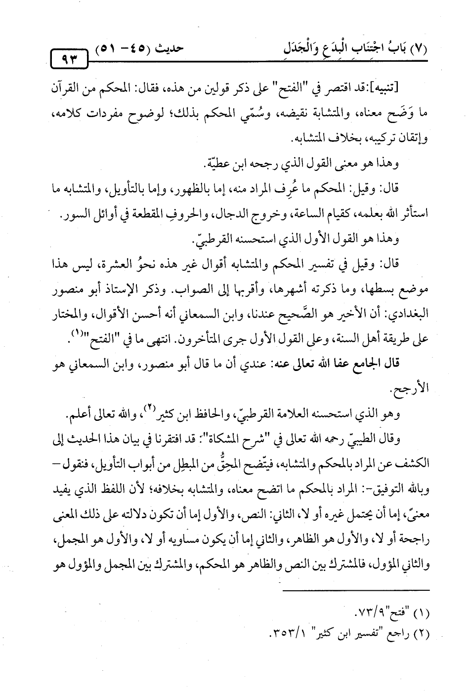 قال: وقيل في تفسير المحكم والمتشابه أقوال غير هذه نحوُ العشرة، ليس هذا موضع بسطها، وما ذكرته أشهرها، وأقربها إلى الصواب. وذكر الأستاذ أبو منصور البغدادي: أن الأخير هو الصَّحيح عندنا، وابن السمعاني أنه أحسن الأقوال، والمختار على طريقة أهل السنة، وعلى القول الأول جرى المتأخرون. انتهى ما في "الفتح" (¬1).