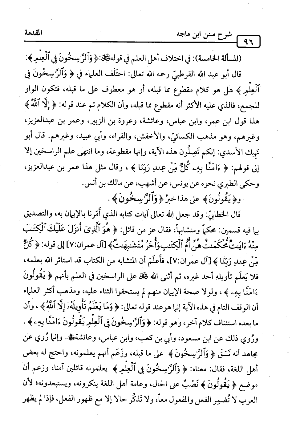(المسألة الخامسة): في اختلاف أهل العلم في قوله عز وجل: {وَالرَّاسِخُونَ في الْعِلْمِ}: قال أبو عبد الله القرطبي رحمه الله تعالى: اختَلَف العلماء في {وَالرَّاسِخُونَ في الْعِلْمِ} هل هو كلام مقطوع مما قبله، أو هو معطوف على ما قبله، فتكون الواو للجمع، فالذي عليه الأكثر أنه مقطوع مما قبله، وأن الكلام تم عند قوله: {إِلَّا اللَّهُ} هذا قول ابن عمر، وابن عباس، وعائشة، وعروة بن الزبير، وعمر بن عبد العزيز، وغيرهم، وهو مذهب الكسائيّ، والأخفش، والفراء، وأبي عبيد، وغيرهم. قال أبو نَهِيك الأسدي: إنكم تَصِلُون هذه الآية، وإنها مقطوعة، وما انتهى علم الراسخين إلا إلى قولهم: {آمَنَّا بِهِ كُلٌّ مِنْ عِنْدِ رَبِّنَا}، وقال مثل هذا عمر بن عبد العزيز، وحكى الطبري نحوه عن يونس، عن أشهب، عن مالك بن أنس.
