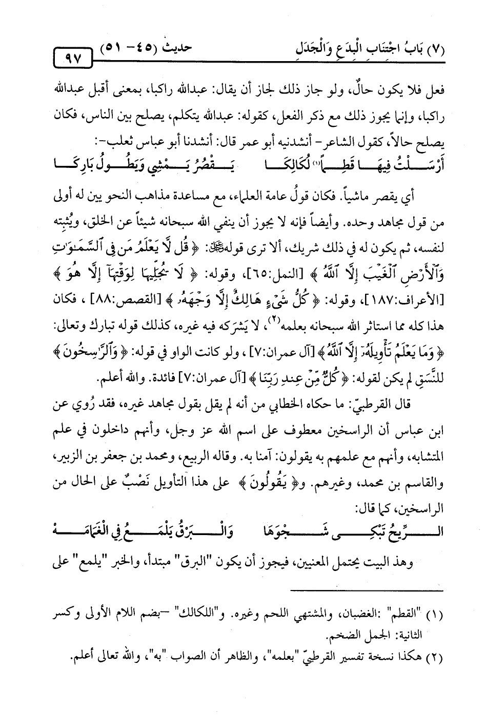 أي يقصر ماشيًا. فكان قولُ عامة العلماء، مع مساعدة مذاهب النحويين له أولى من قول مجاهد وحده. وأيضًا فإنه لا يجوز أن ينفي الله سبحانه شيئًا عن الخلق، ويُثبِته لنفسه، ثم يكون له في ذلك شريك، ألا ترى قوله عز وجل: {قُلْ لَا يَعْلَمُ مَنْ في السَّمَاوَاتِ وَالْأَرْضِ الْغَيْبَ إِلَّا اللَّهُ} [النمل: 65]، وقوله: {لَا يُجَلِّيهَا لِوَقْتِهَا إِلَّا هُوَ} [الأعراف: 187]، وقوله: {كُلُّ شَيْءٍ هَالِكٌ إِلَّا وَجْهَهُ} [القصص: 88]، فكان هذا كله مما استأثر الله سبحانه بعلمه (¬2)، لا يَشركه فيه غيره، كذلك قوله تبارك وتعالى: {وَمَا يَعْلَمُ تَأْوِيلَهُ إِلَّا اللَّهُ} [آل عمران: 7]، ولو كانت الواو في قوله: {وَالرَّاسِخُونَ} للنَّسَقِ لم يكن لقوله: {كُلٌّ مِنْ عِنْدِ رَبِّنَا} [آل عمران: 7] فائدة. والله أعلم.