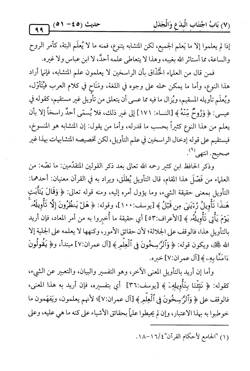 وأما إن أريد بالتأويل المعنى الآخر، وهو التفسير والبيان، والتعبير عن الشيء، كقوله: {نَبِّئْنَا بِتَأْوِيلِهِ} [يوسف: 36] أي بتفسيره، فإن أريد به هذا المعنى، فالوقف على {وَالرَّاسِخُونَ في الْعِلْمِ} [آل عمران: 7]، لأنهم يعلمون، ويَفهَمون ما خوطبوا به بهذا الاعتبار، وإن لم يحيطوا علمًا بحقائق الأشياء على كنه ما هي عليه، وعلى