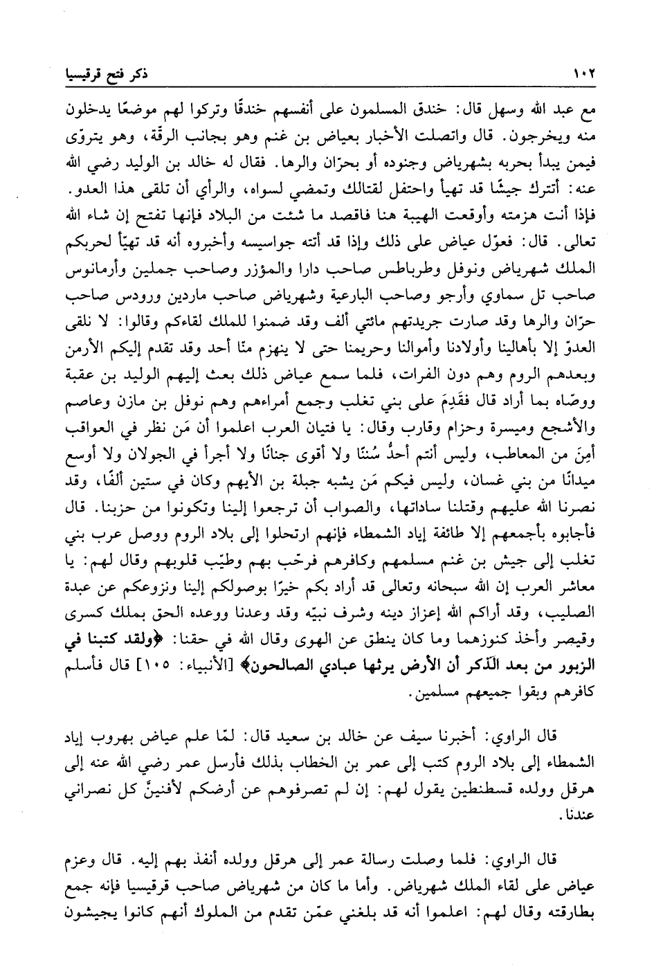 مع عبد الله وسهل قال خندق المسلمون على أنفسهم خندقا وتركوا لهم موضعا يدخلون منه ويخرجون قال: واتصلت الأخبار بعياض بن غنم وهو بجانب الرقة وهو يتروى فيمن يبدأ بحربه بشهرياض وجنوده أو بحران والرها فقال له خالد: بن الوليد رضي الله عنه أتترك جيشا قد تهيأ واحتفل لقتالك وتمضي لسواه والرأي أن تلقي هذا العدو فإذا أنت هزمته وأوقعت الهيبة هناك فاقصد ما شئت من البلاد فإنها تفتح أن شاء الله تعالى قال فعول عياض على ذلك وإذا قد أتته جواسيسه وأخبروه أنه قد تهيأ لحربكم الملك شهرياض ونوفل وطرباطس صاحب دارا والمؤزر وصاحب جملين وأرمانوس صاحب تل سماوي وأرجو وصاحب البارعية وشهرياض صاحب ماردين ورودس صاحب حران والرها وقد صارت جريدتهم مائتي ألف وقد ضمنوا للملك لقاءكم وقالوا: لا نلقي العدو إلا بأهالينا وأولادنا وأموالنا وحريمنا حتى لا ينهزم منا أحد وقد تقدم اليكم الأرمن وبعدهم الروم وهم دون الفرات فلما سمع عياض ذلك بعث إليهم الوليد بن عقبة ووصاه بما اراد قال فقدم على بني تغلب وجمع أمراءهم وهم نوفل بن مازن وعاصم والاشجع وميسرة وحزام وقارب وقال: يا فتيان العرب اعلموا أن من نظر في العواقب أمن من المعاطب وليس أنتم أحد سننا ولا اقوى جنانا ولا أجرا في الجولان ولا أوسع ميدانا من بني غسان وليس فيكم من يشبه جبلة بن الأيهم وكان في ستين ألفا وقد نصرنا الله عليهم وقتلنا ساداتها والصواب أن ترجعوا الينا وتكونوا من حزبنا قال فأجابوه بأجمعهم إلا طائفة اياد الشمطاء فإنهم ارتحلوا إلى بلاد الروم ووصل عرب بني تغلب إلى جيش عياض بن غنم مسلمهم وكافرهم فرحب بهم وطيب قلوبهم وقال لهم: يا معاشر العرب أن الله سبحانه وتعالى قد أراد بكم خيرا بوصولكم الينا ونزوعكم عن عبدة الصليب وقد اراكم الله اعزاز دينه وشرف نبيه وقد وعدنا ووعده الحق بملك كسرى وقيصر وأخذ كنوزهما وما كان ينطق عن الهوى وقال الله في حقنا: {وَلَقَدْ كَتَبْنَا فِي الزَّبُورِ مِنْ بَعْدِ الذِّكْرِ أَنَّ الْأَرْضَ يَرِثُهَا عِبَادِيَ الصَّالِحُونَ} [الانبياء:105] قال فأسلم كافرهم وبقوا جميعهم مسلمين.