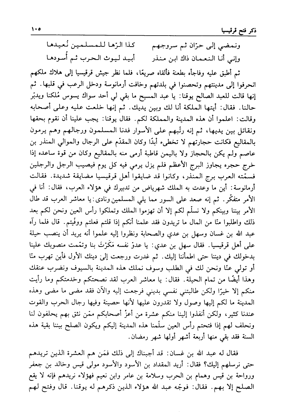 ثم أطبق عليه وفاجأه بطعنه فالقاه صريعا فلما نظر جيش قرقيسيا إلى هلاك ملكهم انحرفوا إلى مدينتهم وتحصنوا في بلدتهم وخافت أرمانوسة ودخل الرعب في قلبها ثم إنها قالت للعبد الصالح يوقنا يا عبد المسيح ما بقى لي أحد سواك يسوس ملكنا ويدبر حالنا فقال: أيتها الملكة أنا لك وبين يديك ثم إنها خلعت عليه وعلى اصحابه وقالت اعلموا أن هذه المدينة والمملكة لكم فقال يوقنا يجب علينا أن نقوم بحقها ونقاتل بين يديها ثم إنه رتبهم على الأسوار فدنا المسلمون ورجالهم وهم يرمون بالمقايع فكانت حجارتهم لا تخطىء أبدا وكان المقدم على الرجال والموالي المنذر بن عاصم ولم يكن بالحجاز ولا باليمن قاطبة أرمى منه بالمقاليع وكان من قوة ساعده إذا خرج حجره يجاوز البرج الأعظم فلم يزل يرمي فيه كل يوم فيصيب الرجل والرجلين فسمته العرب برج المنذر وكانوا قد ضايقوا أهل قرقيسيا مضايقة شديدة فقالت ارمانوسة أين ما وعدت به الملك شهرياض من تدبيرك في هؤلاء العرب فقال أنا في هذا الأمر متفكر ثم إنه صعد على السور مما يلي المسلمين ونادى يا معاشر العرب قد طال الأمر بيننا وبينكم ولا نسلم لكم إلا أن تهزموا الملك وتملكوا رأس العين ونحن لكم بعد ذلك واطلبوا منا من المال ما تريدون فقد علمنا أنكم إذا قلتم فعلتم ووفيتم قال فلما رآه عبد الله بن غسان وسهل بن عدي والصحابة ونظروا إليه علموا انه يريد أن ينصب حيلة على أهل قرقيسيا فقال سهل بن عدي يا عدو نفسه مكرت بنا وتممت منصوبك علينا بدخولك في ديننا حتى اطمأننا اليك ثم غدرت ورجعت إلى دينك الأول فأين تهرب منا او تولي عنا ونحن لك في الطلب وسوف نملك هذه المدينة بالسيوف ونضرب عنقك وهذا أيضا من تمام الحيلة فقال: يا معاشر العرب لقد نصحتكم وخدمتكم وما رأيت منكم إلا خيرا ولكن طالبتني نفسي بديني فرجعت إليه والآن فقد مضى ماضي وهذه المدينة ما لكم اليها وصول ولا تقدرون عليها لأنها حصينة وفيها رجال الحرب والقوت عندنا كثير ولكن انفذوا الينا منكم عشرة من أعز أصحابكم ممن نثق بهم يحلفون لنا ونحلف لهم إذا فتحتم راس العين سلمنا هذه المدينة اليكم ويكون الصلح بيننا بقية هذه السنة فقد بقي منها أربعة اشهر أولها شهر رمضان.