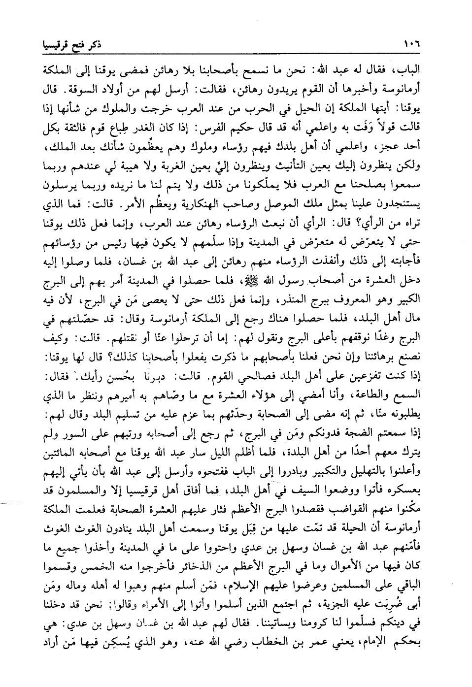 الباب فقال له عبد الله: نحن ما نسمح بأصحابنا بلا رهائن فمضى يوقنا إلى الملكة أرمانوسة وأخبرها أن القوم يريدون رهائن فقالت أرسل لهم من أولاد السوقة قال يوقنا أيتها الملكة أن الحيل في الحرب من عند العرب خرجت والملوك من شأنها إذا قالت قولا وفت به واعلمي أنه قد قال حكيم الفرس إذا كان الغدر طباع قوم فالثقة بكل أحد عجز واعلمي أن أهل بلدك فيهم رؤساء وملوك وهم يعظمون شأنك بعد الملك ولكن ينظرون اليك بعين التأنيث وينظرون الي بعين الغربة ولا هيبة لي عندهم وربما سمعوا بصلحنا مع العرب فلا يملكونا من ذلك ولا يتم لناما نريده وربما يرسلون يستنجدون علينا بمثل ملك الموصل وصاحب الهنكارية ويعظم الأمر قالت فما الذي تراه من الرأي قال الرأي أن نبعث الرؤساء رهائن عند العرب وإنما فعل ذلك يوقنا حتى لا يتعرض له متعرض في المدينة وإذا سلمهم لا يكون فيها رئيس من رؤسائهم فاجابته إلى ذلك وأنفذت الرؤساء منهم رهائن إلى عبد الله بن غسان فلما وصلوا إليه دخل العشرة من أصحاب رسول الله صلى الله عليه وسلم فلما حصلوا في المدينة أمر بهم إلى البرج الكبير وهو المعروف ببرج المنذر وإنما فعل ذلك حتى لا يعصي من في البرج لأن فيه مال أهل البلد فلما حصلوا هناك رجع إلى الملكة ارمانوسة وقال قد حصلتهم في البرج وغدا نوقفهم باعلى البرج ونقول لهم أما أن ترحلوا عنا أو نقتلهم قالت وكيف نصنع برهائننا وإن نحن فعلنا بأصحابهم ما ذكرت يفعلوا بأصحابنا كذلك قال لها يوقنا إذا كنت تفزعين على أهل البلد فصالحي القوم قالت دبرنا بحسن رايك فقال السمع والطاعة وأنا أمضي إلى هؤلاء العشرة مع ما وصاهم به أميرهم وننظر ما الذي يطلبونه منا ثم إنه مضى إلى الصحابة وحدثهم بما عزم عليه من تسليم البلد وقال لهم: إذا سمعتم الضجة فدونكم ومن في البرج ثم رجع إلى أصحابه ورتبهم على السور ولم يترك معهم أحدا من أهل البلدة فلما أظلم الليل سار عبد الله يوقنا مع اصحابه المائتين وأعلنوا بالتهليل والتكبير وبادروا إلى الباب ففتحوه وأرسل إلى عبد الله بأن يأتي إليهم بعسكره فأتوا ووضعوا السيف في أهل البلد فما أفاق أهل قرقيسيا إلا والمسلمون قد مكنوا منهم القواضب فقصدوا البرج الأعظم عليهم العشرة الصحابة فعلمت الملكة أرمانوسة أن الحيلة قد تمت عليها من قبل يوقنا وسمعت أهل البلد ينادون الغوث الغوث فأمنهم عبد الله بن غسان وسهل بن عدي واحتووا على ما في المدينة وأخذوا جميع ما كان فيها من الأموال وما في البرج الأعظم من الذخائر فأخرجوا منه الخمس وقسموا الباقي على المسلمين وعرضوا عليهم الإسلام فمن اسلم منهم وهبوا له أهله وماله ومن أبى ضربت عليه الجزية ثم اجتمع الذين أسلموا وأتوا إلى الأمراء وقالوا: نحن قد دخلنا في دينكم فسلموا لنا كرومنا وبساتيننا فقال لهم عبد الله بن غسان وسهل بن عدي: هي بحكم الامام يعني عمر بن الخطاب رضي الله عنه وهو الذي يسكن فيها من أراد.