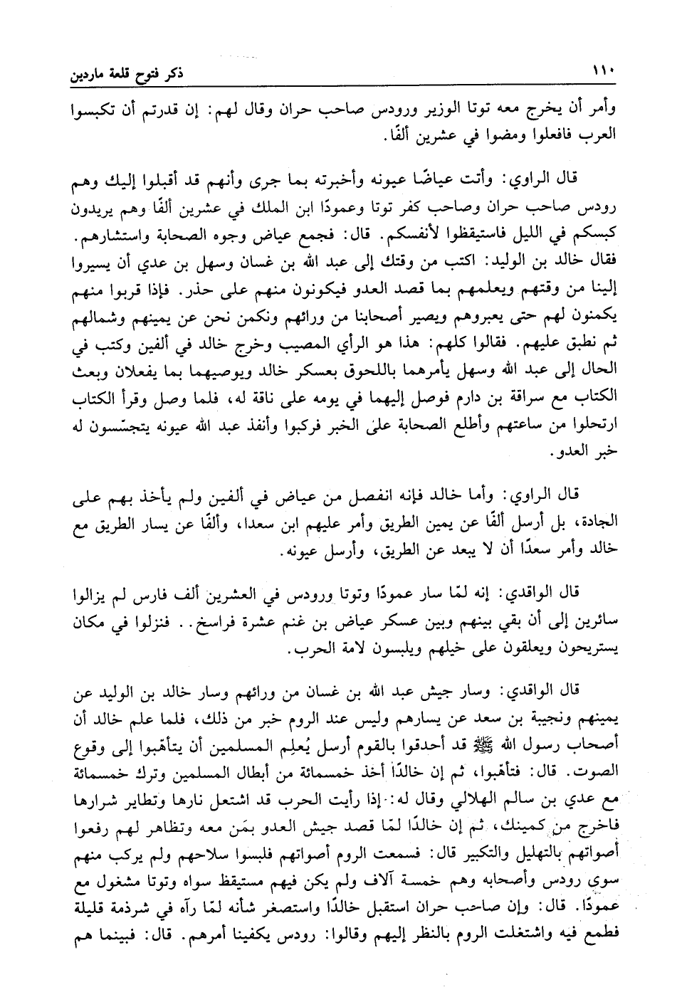 قال الواقدي: وسار جيش عبد الله بن غسان من ورائهم وسار خالد بن الوليد عن يمينهم ونجيبه بن سعد عن يسارهم وليس عند الروم خبر من ذلك فلما علم خالد أن أصحاب رسول الله صلى الله عليه وسلم قد أحدقوا بالقوم أرسل يعلم المسلمين أن يتأهبوا إلى وقوع الصوت قال فتأهبوا ثم أن خالدا أخذ خمسمائة من أبطال المسلمين وترك خمسمائة مع عدي بن سالم الهلالي وقال له: إذا رايت الحرب قد اشتعل نارها وتطاير شرارها فاخرج من كمينك ثم أن خالدا لما قصد جيش العدو بمن معه وتظاهر لهم رفعوا أصواتهم بالتهليل والتكبير قال فسمعت الروم أصواتهم فلبسوا سلاحهم ولم يركب منهم سوى رودس وأصحابه وهم خمسة آلاف ولم يكن فيهم مستيقظ سواه وتوتا مشغول مع عمودا قال: وإن صاحب حران استقبل خالدا واستصغر شأنه لما رآه في شرذمة قليلة فطمع فيه واشتغلت الروم بالنظر إليهم وقالوا: رودس يكفينا أمرهم قال فبينما هم.