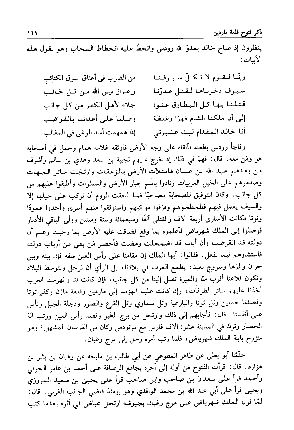 حدثنا أبو يعلى عن طاهر المطوعي عن أبي طالب بن مليحة عن وهبان بن بشر بن هزارد قال قرأت الفتوح من أوله إلى آخره بجامع الرصافة على أحمد بن عامر الحوفي وأحمد قرأ على سعدان بن صاحب وابن صاحب قرأ على يحيى بن سعيد المروزي ويحيى قرأ على أبي عبد الله ابن محمد الواقدي وهو يومئذ قاضي الجانب الغربي قال لما نزل الملك شهرياض على مرج رغبان بجيوشه ارتحل عياض في اثره بعدما كتب.