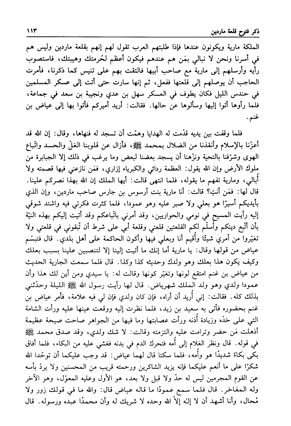 فلما وقفت بين يديه قدمت له الهدايا وهمت أن تسجد له فنهاها وقال أن الله قد اعزنا بالإسلام وانقذنا من الضلال بمحمد صلى الله عليه وسلم فازال عن قلوبنا الغل والحسد واتباع الهوى وشرفنا بالتحية ونزهنا أن يسجد بعضنا لبعض وما يرغب في ذلك إلا الجبابرة من ملوك الأرض وإن الله يقول العظمة ردائي والكبرياء ازاري فمن نازعني فيهما قصمته ولا ابالي ومارية تفهم ما يقوله فلما انتهى قالت أيها الملك أن الله بهذا نصركم علينا قال لها فمن أنت قالت أنا مارية بنت أرسوس بن جارس صاحب ماردين وإن الذي بايديكم اسيرا هو بعلي ولا صبر عليه وهو عمودا فلما كثرت فكرتي فيه واشتد شوقي إليه رأيت المسيح في نومي والحواريين وقد أمرني باتباعكم وقد أتيت اليكم بهذه النية بأن اتبع دينكم وأسلم لكم القلعتين فلعتي وقلعة أبي على شرط أن تبقوني في قلعتي ولا تغيروا من أمري شيئا وأقيم أنا وبعلي فيها وأكون الحاكمة على أهل بلدي قال: فتبسم عياض من قولها وقال: يا مارية أما إنك ما أتيت الينا إلا لتنصبين علينا بسبب بعلك وكيف يكون هذا بعلك وهو ولدك وحديثه كذا وكذا قال فلما سمعت الجارية الحديث من عياض بن غنم امتقع لونها وتغير كونها وقالت له: يا سيدي ومن اين لك هذا وإن عمودا ولدي وهو ولد الملك شهرياض قال لها رايت رسول الله صلى الله عليه وسلم الليلة وحدثني بذلك كله فقالت إني اريد أن أراه فإن كان ولدي فإن لي فيه علامة فأمر عياض بن غنم بحضوره فأتى به سعيد بن زيد فلما نظرت إليه ووقعت عينها عليه ورأت الشامة التي على خده وزيادة اذنه ورأت عصابتها وما فيها من الجواهر صاحت صيحة عظيمة أذهلت من حضر وترامت عليه والتزمته وقالت ولدي لا شك فيه وقد صدق محمد صلى الله عليه وسلم في قوله قال: ونظر الغلام إلى أمه فتحرك الدم في بدنه فغشي عليه من البكاء فلما أفاق بكى بكاء شديدا هو وأمه فلما سكتا قال لهما عياض قد وجب عليكما أن توحدا الله شكرا على ما أنعم عليكما فإنه يزيد الشاكرين ورحمته قريب من المحسنين ولا يرد بأسه عن القوم المجرمين ليس له حد ولا قبل ولا بعد هو الاول وعليه المعول وهو الآخر وله المفاخر قال فلما سمع عمودا ما قاله عياض قال: والله ما في قولك زور ولا محال وأنا أشهد أن لا إله إلا الله وحده لا شريك له وإن محمدا عبده ورسوله قال: