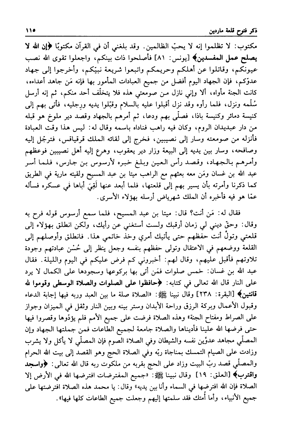 مكتوب لا تظملوا انه لا يحب الظالمين وقد بلغني أن في القرآن مكتوبا: {إِنَّ اللَّهَ لا يُصْلِحُ عَمَلَ الْمُفْسِدِينَ} [يونس: 81] فأصلحوا ذات بينكم واجعلوا تقوى الله نصب عيونكم وقاتلوا عن أهلكم وحريمكم واتبعوا شريعة نبيكم وأخرجوا إلى جهاد عدوكم فإن الجهاد اليوم أفضل من جميع العبادات المأمور بها فإنه من جاهد أعداه كانت الجنة مأواه إلا وإني نازل إلى صومعتي هذه فلا يتخلف أحد منكم ثم إنه ارسل سلمه ونزل فلما رأوه وقد نزل اقبلوا عليه بالسلام وقبلوا يديه ورجليه فاتى بهم إلى كنيسة دمائر وكنيسة باذا فصلى بهم ودعا ثم أمرهم بالجهاد وقصد دير ملوخ هو قبله من دار عبديدان الروم وكان فيه راهب فناداه باسمه وقال له: ليس هذا وقت العبادة فأنزله من صومعته وسار إلى نصيبين فخرج إلى لقائه الملك قرقياقس فترجل إليه وصافحه وسار بين يديه إلى البيعة وزار دير يعقوب وهرع إليه أهل نصيبين فوعظهم وأمرهم بالجهاد وقصدر راس العين وبلغ خبره لأرسوس بن جارس فلما أسر عبد الله بن غسان ومن معه بعثهم مع الراهب ميتا بن عبد المسيح ولقيته مارية في الطريق كما ذكرنا وأمرته بأن يسير بهم إلى قلعتها فلما ابعد عنها لقي أباها في عسكره فسأله عما هو فيه فأخبره أن الملك شهرياض ارسله بهؤلاء الأسرى.