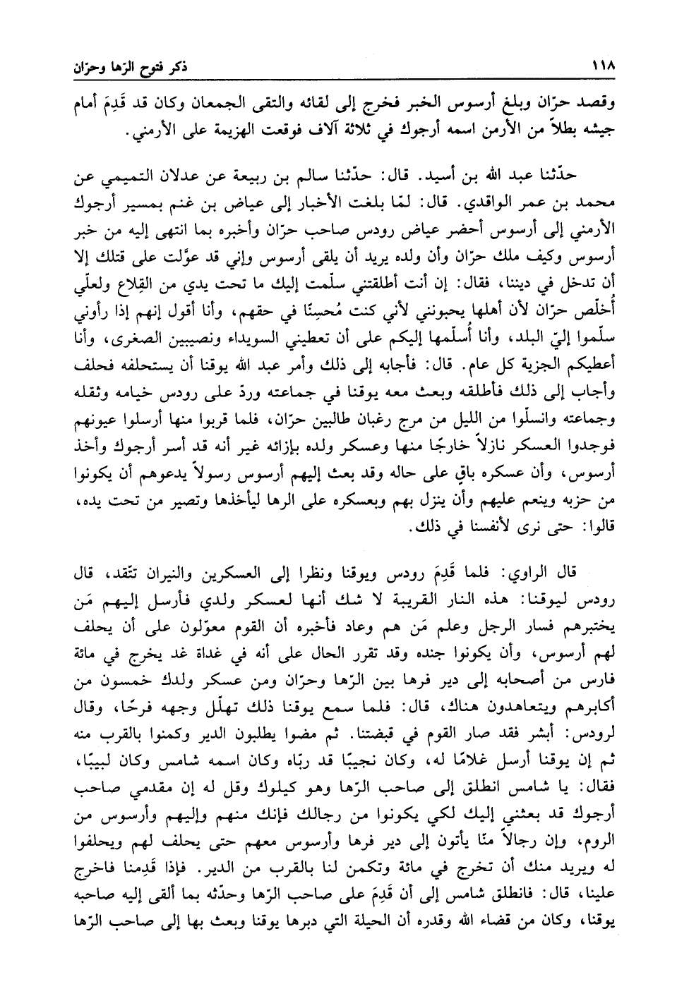 حدثنا عبد الله بن اسيد قال: حدثنا سالم بن ربيعة عن عدلان التميمي عن محمد بن عمر الواقدي قال لما بلغت الاخبار إلى عياض بن غنم بمسير أرجوك الارمني إلى أرسوس أحضر عياض رودس صاحب حران وأخبره بما انتهى إليه من خبر أرسوس وكيف ملك حران وإن ولده يريد أن يلقى أرسوس وإني قد عولت على قتلك إلا أن تدخل في ديننا فقال أن أنت أطلقتني سلمت اليك ما تحت يدي من القلاع ولعلى أخلص حران لأن أهلها يحبونني لاني كنت محسنا في حقهم وأنا أقول انهم إذا رأوني سلموا إلى البلد وأنا أسلمها اليكم على إنك تعطيني السويداء ونصيبين الصغرى وأنا أعطيكم الجزية كل عام قال فأجابه إلى ذلك وأمر عبد الله يوقنا أن يستخلفه فحلف وأجاب إلى ذلك فاطلقه وبعث معه يوقنا في جماعته ورد على رودس خيامه وثقله وجماعته وانسلوا من الليل من مرج رغبان طالبين حران فلما قربوا منها أرسلوا عيونهم فوجدوا العسكر نازلا خارجا منها وعسكر ولده بازائه غير أنه قد اسر أرجوك وأخذه أرسوس وإن عسكره باق على حاله وقد بعث إليهم أرسوس رسولا يدعوهم أن يكونوا من حزبه وينعم عليهم وإن ينزل بهم وبعسكره على الرها ليأخذها وتصير من تحت يده قالوا: حتى نرى لأنفسنا في ذلك.