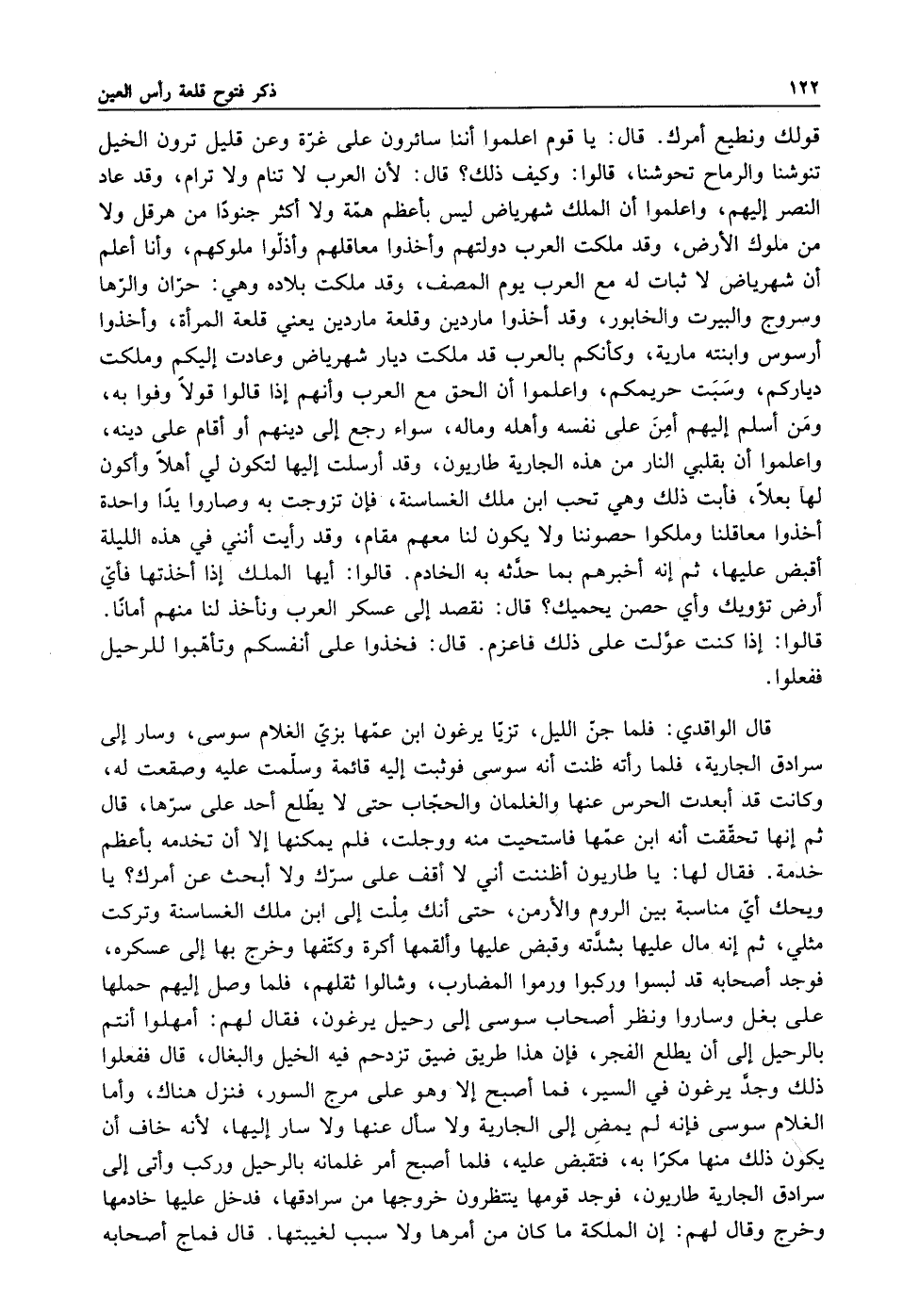 قولك ونطيع أمرك قال: يا قوم اعلموا أننا سائرون على غرة وعن قليل ترون الخيل تنوشنا والرماح تحوشنا قالوا: وكيف ذلك قال: لان العرب لا تنام ولا ترام وقد عاد النصر إليهم واعلموا أن الملك شهرياض ليس بأعظم همة ولا أكثر جنودا من هرقل ولا من ملوك الأرض وقد ملكت العرب دولتهم وأخذوا معاقلهم وأذلوا ملوكهم وأنا أعلم أن شهرياض لاثبات له مع العرب يوم المصف وقد ملكت بلاده وهي حران والرها وسروج والبيرت والخابور وقد أخذوا ماردين وقلعة ماردين يعني قلعة المرأة وأخذوا أرسوس وابنته مارية وكأنكم بالعرب قد ملكت ديار شهرياض وعادت اليكم وملكت دياركم وسبت حريمكم واعلموا أن الحق مع العرب وأنهم إذا قالوا: قولا وفوا به ومن أسلم إليهم أمن على نفسه وأهله وماله سواء رجع إلى دينهم أو أقام على دينه واعلموا أن بقلبي النار من هذه الجارية طاريون وقد أرسلت اليها لتكون لي أهلا وأكون لها بعلا فأبت ذلك وهي تحب ابن ملك السناسنة فإن تزوجت به وصاروا يدا واحدة أخذوا معاقلنا وملكوا حصوننا ولا يكون لنا معهم مقام وقد رأيت أنني في هذه الليلة أقبض عليها ثم إنه أخبرهم بما حدثه به الخادم قالوا: أيها الملك إذا أخذتها فأي أرض تؤويك وأي حصن يحميك قال نقصد إلى عسكر العرب ونأخذ لنا منهم أمانا قالوا: إذا كنت عولت على ذلك فاعزم قال فخذوا على أنفسكم وتأهبوا للرحيل ففعلوا.