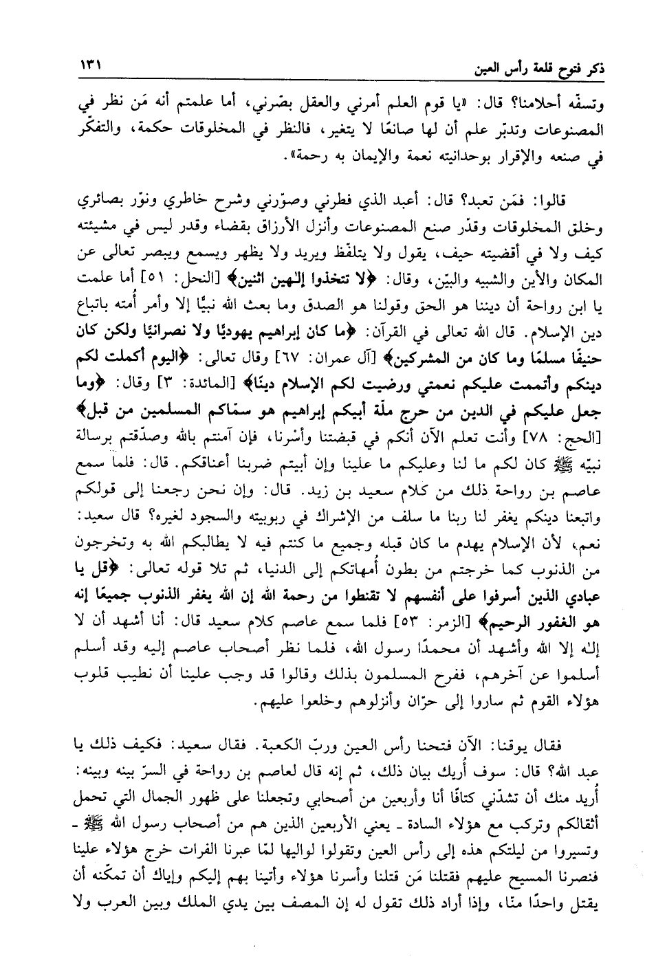 : {مَا كَانَ إِبْرَاهِيمُ يَهُودِيّاً وَلا نَصْرَانِيّاً وَلَكِنْ كَانَ حَنِيفاً مُسْلِماً وَمَا كَانَ مِنَ الْمُشْرِكِينَ} [آل عمران:67] وقال تعالى: {الْيَوْمَ أَكْمَلْتُ لَكُمْ دِينَكُمْ وَأَتْمَمْتُ عَلَيْكُمْ نِعْمَتِي وَرَضِيتُ لَكُمُ الْأِسْلامَ دِيناً} [المائدة: 3] وقال: {وَمَا جَعَلَ عَلَيْكُمْ فِي الدِّينِ مِنْ حَرَجٍ مِلَّةَ أَبِيكُمْ إِبْرَاهِيمَ هُوَ سَمَّاكُمُ الْمُسْلِمِينَ مِنْ قَبْلُ} [الحج: 78] وأنت تعلم الآن أنكم في قبضتنا وأسرنا فإن آمنتم بالله وصدقتم برسالة نبيه صلى الله عليه وسلم كان لكم ما لنا وعليكم ما علينا وإن أبيتم ضربنا أعناقكم قال فلما سمع عاصم بن رواحة ذلك من كلام سعيد ابن زيد قال: وإن نحن رجعنا إلى قولكم واتبعنا دينكم يغفر لنا ربنا ما سلف من الاشراك في ربوبيته والسجود لغيره قال سعيد نعم لأن الإسلام يهدم ما كان قبله وجميع ما كنتم فيه لا يطالبكم الله به وتخرجون من الذنوب كما خرجتم من بطون أمهاتكم إلى الدنيا ثم تلاقوله تعالى: {قُلْ يَا عِبَادِيَ الَّذِينَ أَسْرَفُوا عَلَى أَنْفُسِهِمْ لا تَقْنَطُوا مِنْ رَحْمَةِ اللَّهِ إِنَّ اللَّهَ يَغْفِرُ الذُّنُوبَ جَمِيعاً إِنَّهُ هُوَ الْغَفُورُ الرَّحِيمُ} [الزمر:53] فلما سمع عاصم كلام سعيد قال: أنا أشهد أن لا إله إلا الله وأشهد أن محمدا رسول الله فلما نظر أصحاب عاصم إليه وقد أسلم أسملوا عن آخرهم ففرح المسلمون بذلك وقالوا: قد وجب علينا أن نطيب قلوب هؤلاء القوم ثم ساروا إلى حران وأنزلوهم وخلعوا عليهم.