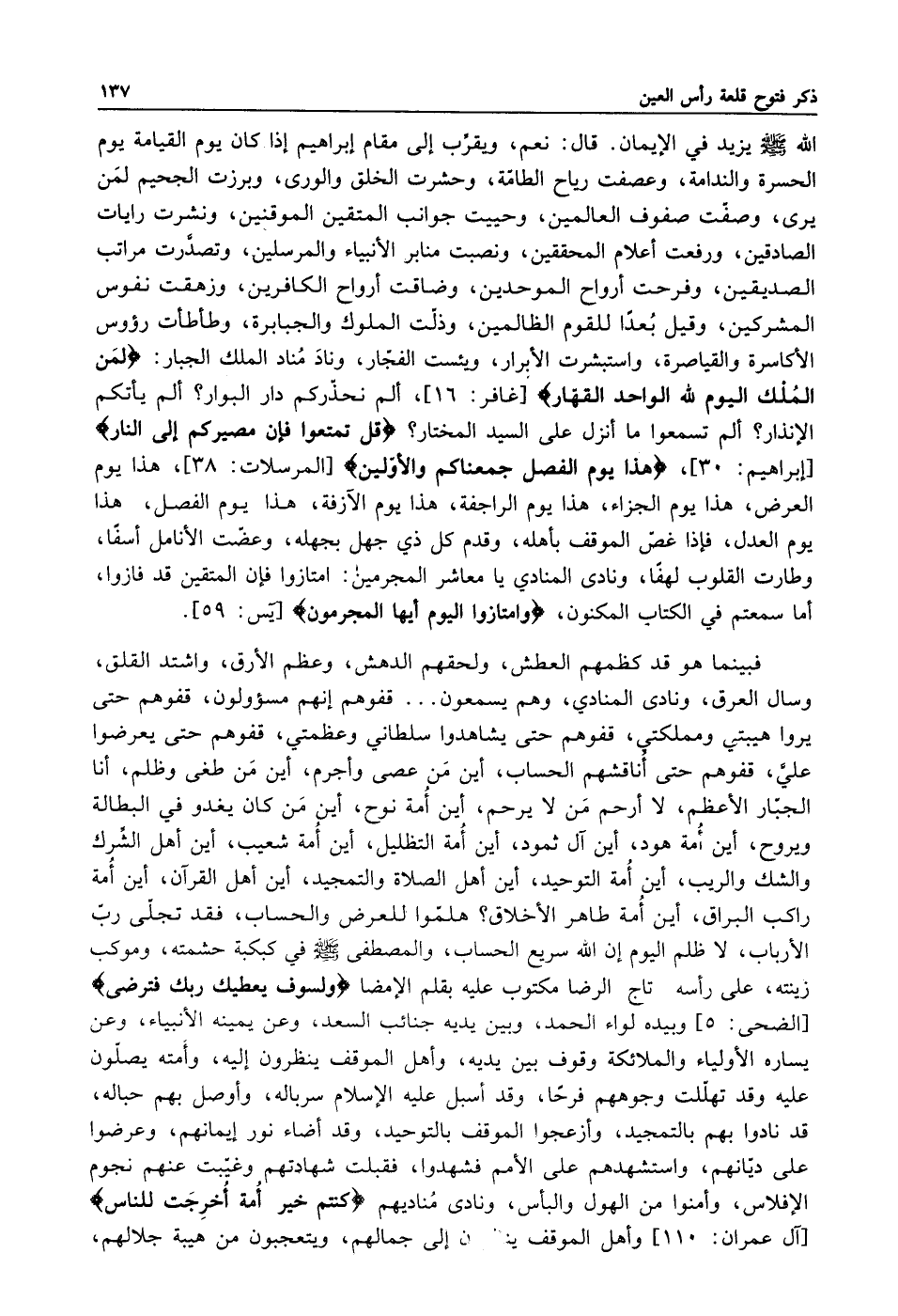الله صلى الله عليه وسلم يزيد في الإيمان قال: نعم ويقرب إلى مقام ابراهيم إذا كان يوم القيامة يوم الحسرة والندامة وعصفت رياح الطامة وحشرت الخلق والورى وبرزت الجحيم لمن يرى وصفت صفوف العالمين وحييت جوانب المتقين الموقنين ونشرت رايات الصادقين ورفعت أعلام المحققين ونصبت منابر الانبياء والمرسلين وتصدرت مراتب الصديقين وفرحت أرواح الموحدين وضاقت أرواح الكافرين وزهقت نفوس المشركين وقيل بعدا للقوم الظالمين وذلت الملوك والجبابرة وطأطأت رؤوس الاكاسرة والقياصرة واستبشرت الابرار ويئست الفجار وناد مناد الملك الجبار: {لِمَنِ الْمُلْكُ الْيَوْمَ لِلَّهِ الْوَاحِدِ الْقَهَّارِ} [غافر: 16] ألم نحذركم دار البوار ألم يأتكم الانذار ألم تسمعوا ما أنزل على السيد المختار: {قُلْ تَمَتَّعُوا فَإِنَّ مَصِيرَكُمْ إِلَى النَّارِ} [ابراهيم: 30] : {هَذَا يَوْمُ الْفَصْلِ جَمَعْنَاكُمْ وَالْأَوَّلِينَ} [المرسلات:38] هذا يوم العرض هذا يوم الجزاء هذا يوم الراجفة هذا يوم الازفة هذا يوم الفصل هذا يوم العدل فإذا غص الموقف بأهله وقدم كل ذي جهل بجهله وعضت الانامل اسفا وطارت القلوب لهفا ونادى المنادي يا معاشر المجرمين امتازوا فإن المتقين قد فازوا أما سمعتم في الكتاب المكنون: {وَامْتَازُوا الْيَوْمَ أَيُّهَا الْمُجْرِمُونَ} [يّس:59] .