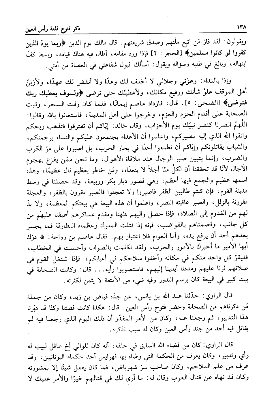 قال الراوي: حدثنا عبد الله بن يانس عن جده فياض بن زيد وكان من جملة من ذكرناهم من الصحابة وحضر فتوح رأس العين قال هكذا كانت قصتنا وكنا قد دبرنا هذا التدبير ثم رجعنا عنه وكان من الامر المقدر أن ذلك اليوم الذي رجعنا فيه لم يقاتل فيه أحد من جند رأس العين وكان له سبب نذكره.