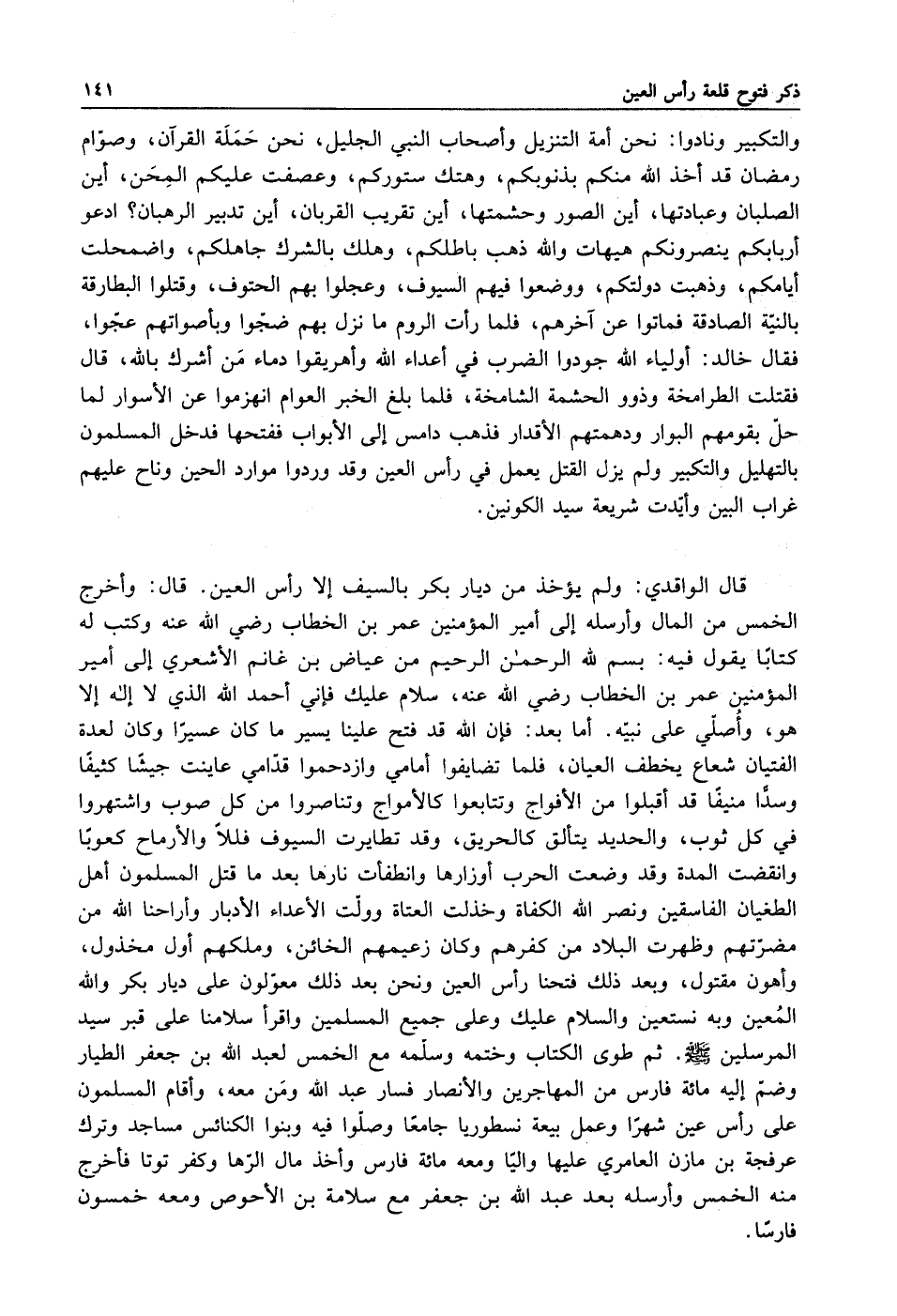 قال الواقدي: ولم يؤخذ من ديار بكر بالسيف إلا رأس العين قال: وأخرج الخمس من المال وأرسله إلى أمير المؤمنين عمر بن الخطاب رضي الله عنه وكتب له كتابا يقول فيه بسم الله الرحمن الرحيم من عياض بن غنم الأشعري إلى أمير المؤمنين عمر بن الحطاب رضي الله عنه سلام عليك فإني أحمد الله الذي لا إله إلا هو وأصلي على نبيه أما بعد فإن الله قد فتح علينا يسير ما كان عسيرا وكان لعدة الفتيان شعاع يخطف العيان فلما تضايقوا أمامي وازدحموا قدامي عاينت جيشا كثيفا وسدا منيفا قد اقبلوا من ألافواج وتتابعوا كالامواج وتناصروا من كل صوب واشتهروا في كل ثوب والحديد يتالق كالحريق وقد تطايرت السيوف فللا والأرماح كعوبا وانقضت المدة وقد وضعت الحرب أوزارها وانطفأت نارها بعد ما قتل المسلمون أهل الطغيان الفاسقين ونصر الله الكفارة وخذلت العتاة وولت الأعداء الأدبار وأراحنا الله من مضرتهم وطهرت البلاد من كفرهم وكان زعيمهم الخائن وملكهم أول مخذول وأهون مقتول وبعد ذلك فتحنا رأس العين ونحن بعد ذلك معولون على ديار بكر والله المعين وبه نستعين والسلام عليك وعلى جميع المسلمين واقرأ سلامنا على قبر سيد المرسلين صلى الله عليه وسلم ثم طوى الكتاب وختمه وسلمه مع الخمس لعبد الله بن جعفر الطيار وضم إليه مائة فارس من المهاجرين والأنصار فسار عبد الله ومن معه وأقام المسلمون على رأس عين شهرا وعمل بيعة نسطوريا جامعا وصلوا فيه وبنوا الكنائس مساجد وترك عرفجة بن مازن العامري عليها واليا ومعه مائة فارس وأخذ مال الرها وكفر توتا فأخرج منه الخمس وأرسله بعد عبد الله بن جعفر مع سلامة بن الأحوص ومعه خمسون فارسا.