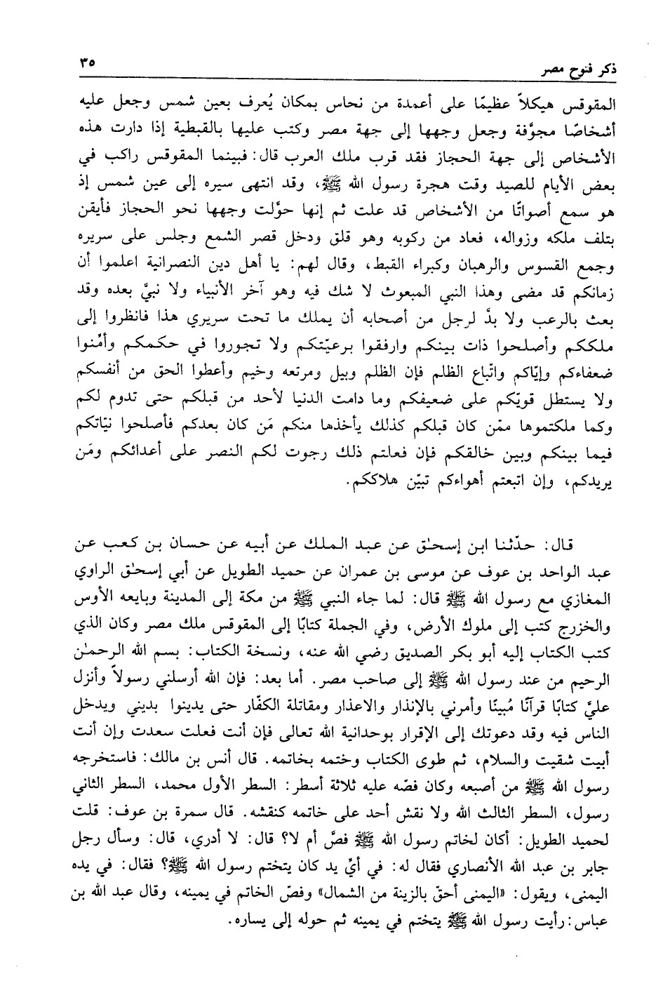 قال: حدثنا ابن اسحق عن عبد الملك عن أبيه عن حسان بن كعب عن عبد الواحد بن عوف عن موسى بن عمران عن حميد الطويل عن أبي اسحق الراوي المغازي مع رسول الله صلى الله عليه وسلم قال لما جاء النبي صلى الله عليه وسلم من مكة إلى المدينة وبايعه الأوس والخزرج كتب إلى ملوك الأرض وفي الجملة كتابا إلى المقوقس ملك مصر وكان الذي كتب الكتاب إليه أبو بكر الصديق رضي الله عنه ونسخةى الكتاب بسم الله الرحمن الرحيم من عند رسول الله صلى الله عليه وسلم إلى صاحب مصر أما بعد فإن الله أرسلني رسولا وأنزل علي كتابا قرآنا مبينا وأمرني بالانذار والاعذار ومقاتلة الكفار حتى يدينوا بديني ويدخل الناس فيه وقد دعوتك إلى الاقرار بوحدانية الله تعالى فإن أنت فعلت سعدت وإن أنت أبيت شقيت والسلام ثم طوى الكتاب وختمه بخاتمه قال أنس بن مالك فاستخرجه رسول الله صلى الله عليه وسلم من أصبعه وكان فصه عليه ثلاثة أسطر السطر الأول محمد السطر الثاني رسول السطر الثالث الله ولا نقش أحد على خاتمه كنقشه قال سمرة بن عوف قلت لحميد الطويل أكان لخاتم رسول الله صلى الله عليه وسلم فص أم لا قال: لا أدري قال: وسأل رجل جابر بن عبد الله الأنصاري فقال له: في أي يد كان يتختم رسول الله صلى الله عليه وسلم فقال في يده اليمنى ويقول: "اليمنى أحق بالزينة من الشمال" وفص الخاتم في يمينه وقال عبد الله بن عباس رأيت رسول الله صلى الله عليه وسلم يتختم في يمينه ثم حوله إلى يساره.