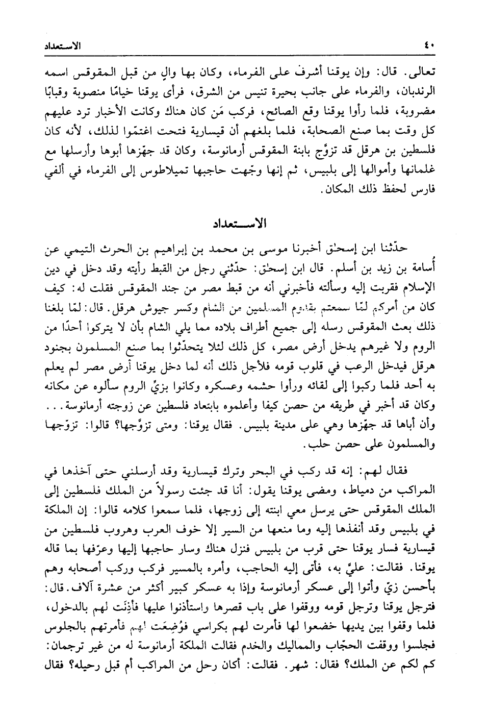 حدثنا ابن اسحق أخبرنا موسى بن محمد بن ابراهيم بن الحرث التيمي عن أسامة ابن زيد بن أسلم قال ابن اسحق: حدثني رجل من القبط رأيته وقد دخل في دين الإسلام فقربت إليه وسألته فاخبرني أنه من قبط مصر من جند المقوقس فقلت له كيف كان من أمركم لما سمعتم بقدوم المسلمين من الشام وكسر جيوش هرقل قال لما بلغنا ذلك بعث المقوقس رسله إلى جميع اطراف بلاده مما يلي الشام بأن لا يتركوا أحدا من الروم ولا غيرهم يدخل أرض مصر كل ذلك لئلا يتحدثوا بما صنع المسلمون بجنود هرقل فيدخل الرعب في قلوب قومه فلأجل ذلك أنه لما دخل يوقنا أرض مصر لم يعلم به أحد فلما ركبوا إلى لقائه ورأوا حشمه وعسكره وكانوا بزي الروم سالوه عن مكانه وكان قد أخبر في طريقه من حصن كيفا وأعلموه بابتعاد فلسطين عن زوجته أرمانوسة وإن اباها قد جهزها وهي على مدينة بلبيس فقال يوقنا ومتى تزوجها قالوا: تزوجها والمسلمون على حصن حلب.