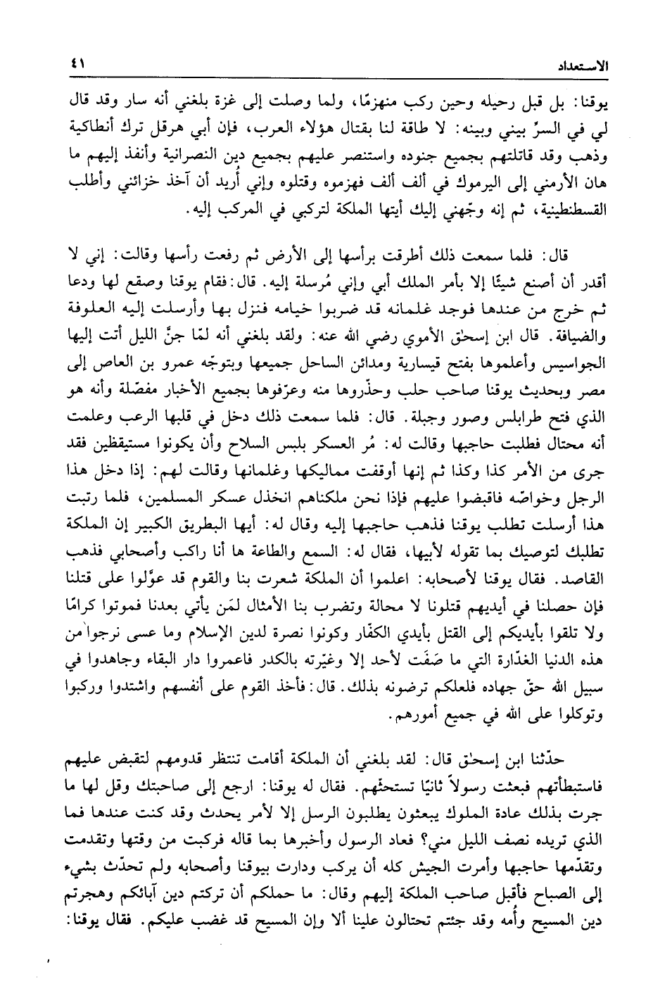يوقنا: بل قبل رحيله وحين ركب منهزما ولما وصلت إلى غزة بلغني أنه سار وقد قال لي في السر بيني وبينه لا طاقة لنا بقتال هؤلاء العرب فإن أبي هرقل ترك أنطاكية وذهب وقد قاتلهم بجميع جنوده واستنصر عليهم بجيمع دين النصرانية وأنفذ إليهم ماهان الأرمني إلى اليرموك في ألف ألف فهزموه وقتلوه وإني اريد أن آخذ خزائني وأطلب القسطنطينية ثم إنه وجهني اليك أيتها الملكة لتركبي في المركب إليه.