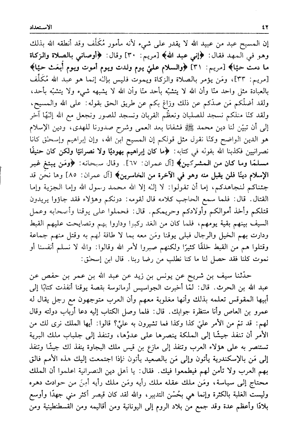إن المسيح عبد من عبيد الله لا يقدر على شيء لانه مأمور مكلف وقد أنطقه الله بذلك وهو في المهد فقال: {إِنِّي عَبْدُ اللَّهِ} [مريم: 30] وقال: {وَأَوْصَانِي بِالصَّلاةِ وَالزَّكَاةِ مَا دُمْتُ حَيّاً*وَالسَّلامُ عَلَيَّ يَوْمَ وُلِدْتُ وَيَوْمَ أَمُوتُ وَيَوْمَ أُبْعَثُ حَيّاً} [مريم:33] ومن يؤمر بالصلاة والزكاة ويموت فليس باله إنما هو عبد الله مكلف بالعبادة مثل واحد منا وإن الله لا يتشبه بأحد منا وإن الله لا يشبهه شيء ولا يتشبه بأحد ولقد أضلكم من صدكم عن ذلك وزاغ بكم عن طريق الحق بقوله على الله والمسيح ولقد كنا مثلكم نسجد للصلبان ونعظم القربان ونسجد للصور ونجعل مع الله الها آخر إلى أن تبين لنا دين محمد صلى الله عليه وسلم فشفانا بعد العمى وشرح صدورنا للهدى ودين الإسلام هو الدين الواضح وكنا نقول مثل قولكم أن المسيح ابن الله وإن ابراهيم واسحق كانا نصرانيين فكذبنا الله بقوله في كتابه: {مَا كَانَ إِبْرَاهِيمُ يَهُودِيّاً وَلا نَصْرَانِيّاً وَلَكِنْ كَانَ حَنِيفاً مُسْلِماً وَمَا كَانَ مِنَ الْمُشْرِكِينَ} [آل عمران:67] وقال سبحانه: {وَمَنْ يَبْتَغِ غَيْرَ الْأِسْلامِ دِيناً فَلَنْ يُقْبَلَ مِنْهُ وَهُوَ فِي الْآخِرَةِ مِنَ الْخَاسِرِينَ} [آل عمران:85] وها نحن قد جئناكم لنجاهدكم اما أن تقولوا لا إله إلا الله محمد رسول الله واما الجزية واما القتال قال فلما سمع الحاجب كلامه قال لقومه دونكم وهؤلاء فقد جاءوا يريدون قتلكم وأخذ أموالكم وأولادكم وحريمكم قال فحملوا على يوقنا وأصحابه وعمل السيف بينهم بقية يومهم فلما كان من الغد ركبوا وداروا بهم وتصايحت عليهم القبط ودارت بهم الخيل والرجال فبلى يوقنا ومن معه بما لا طاقة لهم به وقتل منهم جماعة وقتلوا هم من القبط خلقا كثيرا ولكنهم صبروا لأمر الله وقالوا: والله لا نسلم أنفسنا أو نموت كلنا فقد حصل لنا ما كنا نطلب من رضا ربنا قال ابن اسحق.