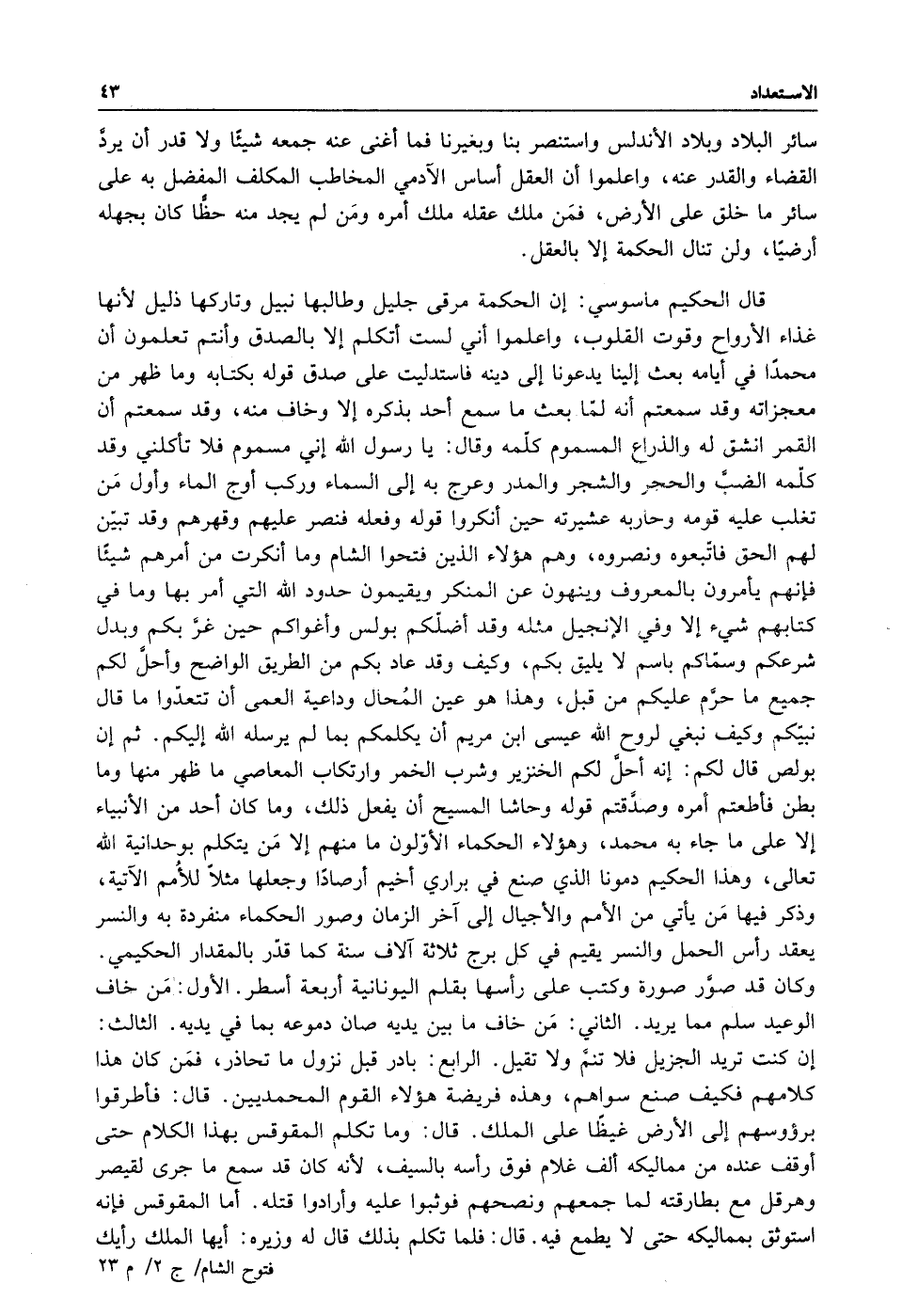 قال الحكيم ماسوسي: أن الحكمة مرقى جليل وطالبها نبيل وتاركها ذليل لانها غذاء الارواح وقوت القلوب واعلموا أني لست أتكلم إلا بالصدق وأنتم تعلمون أن محمدا في ايامه بعث الينا يدعونا إلى دينه فاستدليت على صدق قوله بكتابه وما ظهر من معجزاته وقد سمعتم أنه لما بعث ما سمع أحد بذكره إلا وخاف منه وقد سمعتم أن القمر انشق له والذراع المسموم كلمه وقال: يا رسول الله أني مسموم فلا تأكلني وقد كلمه الضب والحجر والشجر والمدر وعرج به إلى السماء وركب أوج الماء وأول من تغلب عليه قومه وحاربه عشيرته حين أنكروا قوله وفعله فنصر عليهم وقهرهم وقد تبين لهم الحق فاتبعوه ونصروه وهم هؤلاء الذين فتحوا الشام وما أنكرت من أمرهم شيئا فإنهم يأمرون بالمعروف وينهون عن المنكر ويقيمون حدود الله التي أمر بها وما في كتابهم شيء إلا وفي الانجيل مثله وقد اضلكم بولس وأغواكم حين غر بكم وبدل شرعكم وسماكم باسم لا يليق بكم وكيف وقد عاد بكم من الطريق الواضح وأحل لكم جيمع ما حرم عليكم من قبل وهذا هو عين المحال وداعية العمى أن تتعدوا ما قال نبيكم وكيف نبغي لروح الله عيسى بن مريم أن يكلمكم بما لم يرسله الله اليكم ثم أن بولص قال لكم انه أحل لكم الخنزير وشرب الخمر وارتكاب المعاصي ما ظهر منها وما بظن فاطعتم أمره وصدقتم قوله وحاشا المسيح أن يفعل ذلك وما كان أحد من الانبياء إلا على ما جاء به محمد وهؤلاء الحكماء الأولون ما منهم إلا من يتكلم بوحدانية الله تعالى وهذا الحكيم دمونا الذي صنع في براري اخيم ارصادا وجعلها مثلا للامم الآتية وذكر فيها من يأتي من الامم والاجيال إلى آخر الزمان وصور الحكماء منفردة به والنسر يعقد رأس الحمل والنسر يقيم في كل برج ثلاثة آلاف سنة كما قدر بالمقدار الحكيمي وكأن قدر صور صورة وكتب على رأسها بقلم اليونانية أربعة اسطر الاول من خاف الوعيد سلم مما يريد الثاني من خاف ما بين يديه صان دموعه بما في يديه الثالث أن كنت تريد الجزيل فلا تنم ولا تقيل الرابع بادر قبل نزول ما تحاذر فمن كان هذا كلامهم فكيف صنع سواهم وهذه فريضة هؤلاء القوم المحمديين قال فأطرقوا برؤوسهم إلى الأرض غيظا على الملك قال: وما تلكم المقوقس بهذا الكلام حتى أوقف عنده من مماليكه الف غلام فوق رأسه بالسيف لانه كان قد سمع ما جرى لقيصر وهرقل مع بطارقته لما جمعهم ونصحهم فوثبوا عليه وارادوا قتله أما المقوقس فإنه استوثق بمماليكه حتى لا يطمع فيه قال فلما تكلم بذلك قال له وزيره: أيها الملك رأيك
