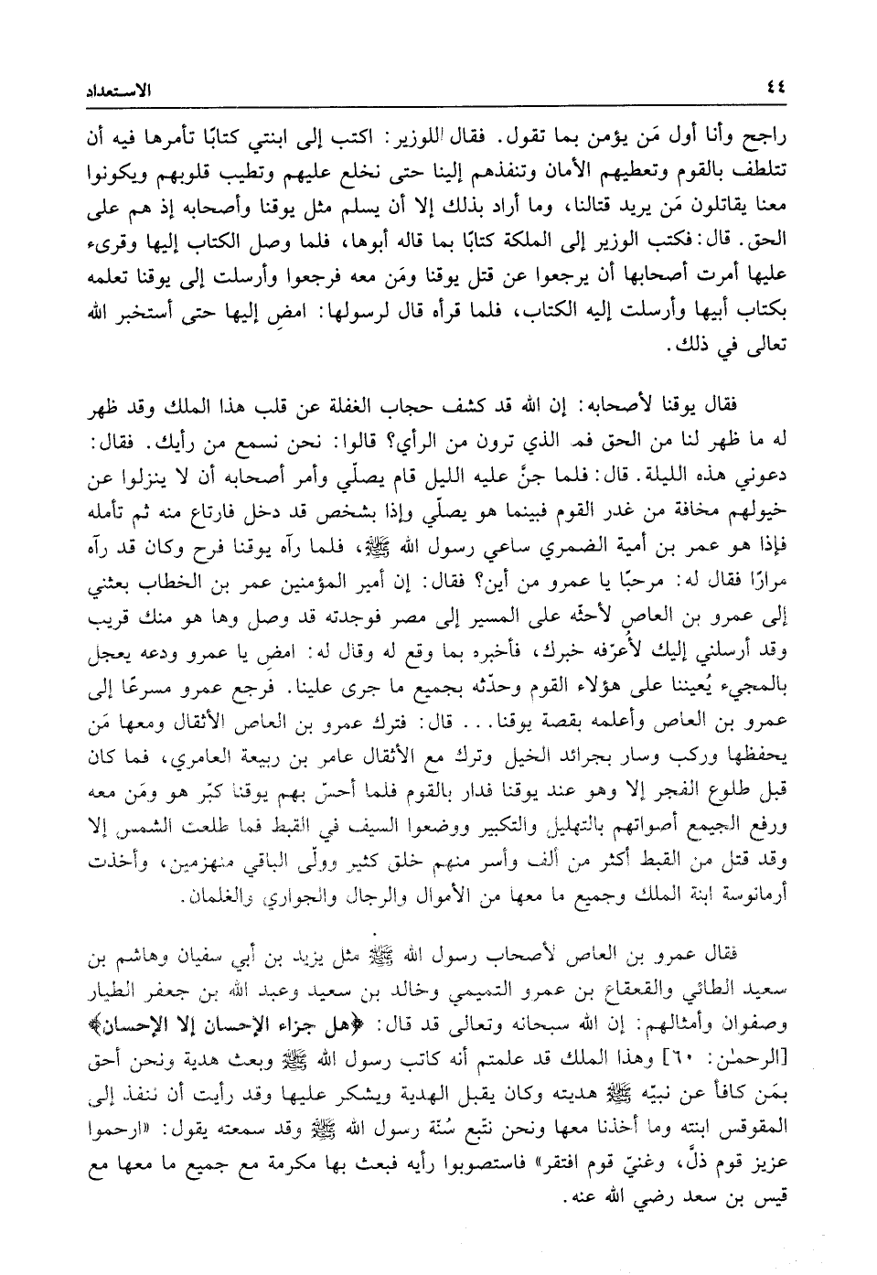 فقال عمرو بن العاص لاصحاب رسول الله صلى الله عليه وسلم مثل يزيد بن أبي سفيان وهاشم بن سعيد الطائي والقعقاع بن عمرو التميمي وخالد بن سعيد وعبد الله بن جعفر الطيار وصفوان وأمثالهم أن الله سبحانه وتعالى قد قال: {هَلْ جَزَاءُ الْأِحْسَانِ إِلَّا الْأِحْسَانُ} [الرحمن:60] إلا الاحسان وهذا الملك قد علمتم أنه كاتب رسول الله صلى الله عليه وسلم وبعث هدية ونحن أحق بمن كافأ عن نبيه صلى الله عليه وسلم هديته وكان يقبل الهدية ويشكر عليها وقد رأيت أن ننفذ إلى المقوقس ابنته وما أخذنا معها ونحن نتبع سنة رسول الله صلى الله عليه وسلم وقد سمعته يقول: "ارحموا عزيز قوم ذل وغني قوم افتقر" فاستصوبوا رأيه فبعث بها مكرمة مع جميع ما معها مع قيس بن سعد رضي الله عنه.