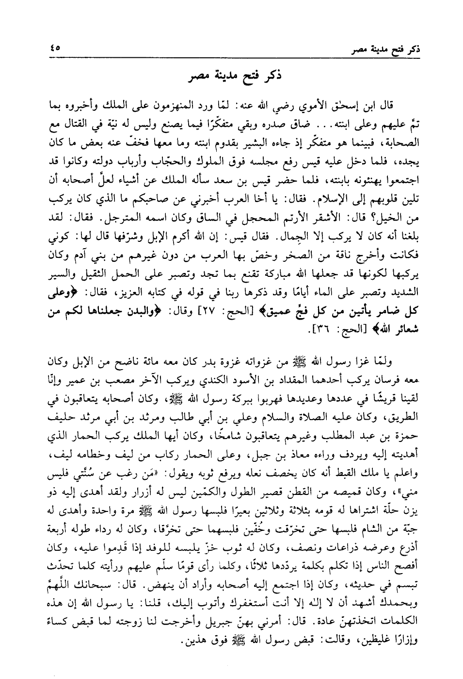 ولما غزا رسول الله صلى الله عليه وسلم من غزواته غزوة بدر كان معه مائة ناضح من الأبل وكان معه فرسان يركب أحدهما المقداد بن الاسود الكندي ويركب الاخر مصعب بن عمير وانا لقينا قريشا في عددها وعديدها فهربوا ببركة رسول الله صلى الله عليه وسلم وكان اصحابه يتعاقبون في الطريق وكان عليه الصلاة والسلام وعلي بن أبي طالب ومرثد بن أبي مرثد حليف حمزة بن عبد المطلب وغيرهم يتعاقبون شامخا وكان أيها الملك يركب الحمار الذي أهديته إليه ويردف وراءه معاذ بن جبل وعلى الحمار ركاب من ليف وخطامه ليف واعلم يا ملك القبط أنه كان يخصف نعله ويرقع ثوبه ويقول: "من رغب عن سنتي فليس مني" وكان قميصه من القطن قصير الطول والكمين ليس له ازرار ولقد أهدى إليه ذويزن حلة اشتراها له قومه بثلاثة وثلاثين بعيرا فلبسها رسول الله صلى الله عليه وسلم مرة واحدة وأهدى له جبة من الشام فلبسها حتى تخرقت وخفين فلبسهما حتى تخرقا وكان له رداء طوله أربعة أذرع وعرضه ذراعات ونصف وكان له ثوب خز يلبسه للوفد إذا قدموا عليه وكان افصح الناس إذا تكلم بكلمة يرددها ثلاثا وكلما راى قوما سلم عليهم ورأيته كلما تحدث تبسم في حديثه وكان إذا اجتمع إليه اصحابه واراد أن ينهض قال سبحانك اللهم وبحمدك اشهد أن لا إله إلا انت استغفرك واتوب اليك قلنا يا رسول الله أن هذه الكلمات اتخذتهن عادة قال امرني بهن جبريل واخرجت لنا زوجته لما قبض كساء وازارا غليظين وقالت قبض رسول الله صلى الله عليه وسلم فوق هذين.
