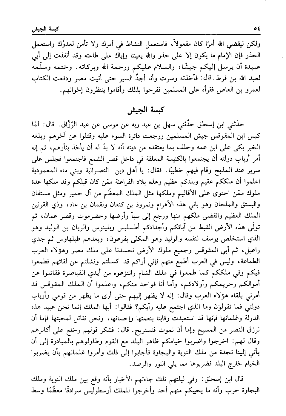 حدثني ابن اسحق حدثني سهل بن عبد ربه عن موسى عبد الرزاق قال لما كبس ابن المقوقس جيش المسلمين ورجعت دائرة السوء عليه وقتلوا عن آخرهم وبلغه الخبر بكى على ابن عمه وحلف بما يعتقده من دينه انه لا بد له أن يأخذ بثأرهم ثم إنه أمر أرباب دولته أن يجتمعوا بالكنيسة المعلقة في داخل قصر الشمع فاجتمعوا فجلس على سرير عند المذبح وقام فيهم خطيبا فقال: يا أهل دين النصرانية وبني ماء المعمودية اعلموا أن ملككم عقيم وبلدكم عظيم وهذه بلاد الفراعنة ممن كان قبلكم وقد ملكها عدة ملوك ممن احتوى على الاقاليم وملكها مثل الملك المعظم من آل حمير ومثل مستفان والبستق والملحان وهو يأتي هذه الاهرام ونمرود ابن كنعان ولقمان بن عاد وذي القرنين الملك العظيم وانقضى ملكهم منها ورجع إلى سبأ وأرضها وحضرموت وقصر عمان ثم تولى هذه الأرض القبط من آبائكم وأجدادكم اطسليس وبلينوس والريان بن الوليد وهو الذي استخلص يوسف لنفسه والوليد وهو المكنى بفرعون وبعدهم طبلهاوس ثم جدي راعيل ثم أبي المقوقس وجميع ملوك الأرض تحسدنا على ملك مصر وهؤلاء العرب الطماعة وليس في العرب أطمع منهم فإني أراكم قد كسلتم وفشلتم عن لقائهم فطمعوا فيكم وفي ملككم كما طمعوا في ملك الشام وانتزعوه من أيدي القياصرة فقاتلوا عن أموالكم وحريمكم وأولادكم وأما أنا فواحد منكم وأعلموا أن الملك المقوقس قد أمرني بلقاء هؤلاء العرب وقال انه لا يظهر إليهم حتى أرى ما يظهر من قومي وأرباب دولتي فما تقولون وما الذي اجتمع عليه رأيكم فقالوا: أيها الملك إنما نحن عبيد هذه الدولة وغلمانها فإنها قد استعبدت رقابنا بنعمتها واحسانها ونحن نقاتل لمحبتها فإما أن نرزق النصر من المسيح واما أن نموت فنستريح قال فشكر قولهم وخلع على أكابرهم وقال لهم: اخرجوا واضربوا خيامكم ظاهر البلد مع القوم وطاولوهم بالمبادرة إلى أن يأتي الينا نجدة من ملك النوبة والبجاوة فأجابوا إلى ذلك وأمروا غلمانهم بأن يضربوا الخيام خارج البلد فضربوها مما يلي النور والرصد.