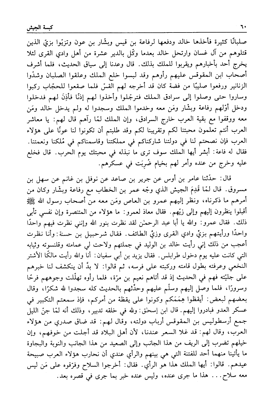 صلبانا كثيرة فأخذها خالد ودفعها لرفاعة بن قيس وبشار بن عون وتزيوا بزي الذين قتلوهم من آل غسان وارتحل خالد بعد ما وكل بالدير عشرة من أهل وادي القرى لئلا يخرج أحد بأخبارهم ويقربوا للملك بذلك قال: وعدنا إلى سياق الحديث فلما أشرف أصحاب ابن المقوقس عليهم راوهم وقد لبسوا خلع الملك وعلقوا الصلبان وشدوا الزنانير ورفعوا صليبا من فضة كان قد أخرجه لهم القس فلما صقعوا للحجاب ركبوا وساروا حتى وصلوا إلى سرادق الملك فترجلوا وقد أخذوا لهم اذنا فأذن لهم فدخلوا ودخل أولهم رفاعة وبشار ومن معه وخدموا الملك وسجدوا له ولم يدخل خالد ومن معه ووقفوا مع بقية العرب خارج السرادق وإن الملك لما رآهم قال لهم: يا معاشر العرب أنتم تعلمون محبتنا لكم وتقريبنا لكم وقد طلبتم أن تكونوا لنا عونا على هؤلاء العرب فإن نصحتم لنا في دولتنا شاركناكم في مملكتنا وقاسمناكم في ملكنا ونعمتنا فقال له رفاعة: أبشر أيها الملك سوف ترى ما نبذله في محبتك يوم الحرب قال فخلع عليه وخرج من عنده وأمرلهم بخيام تضرب في عسكرهم.