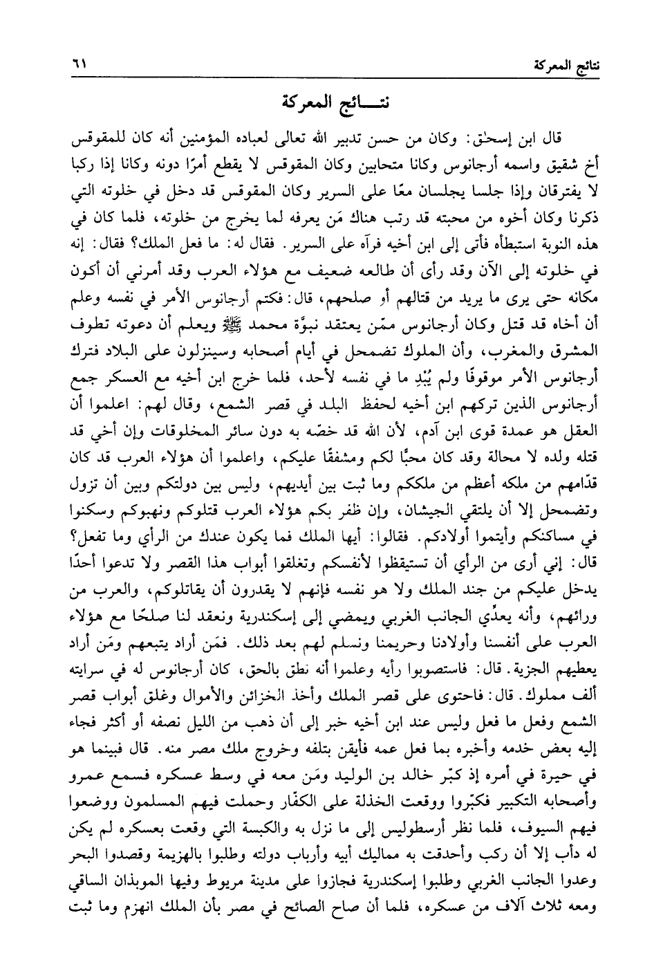قال ابن اسحق: وكان من حسن تدبير الله تعالى لعباده المؤمنين انه كان للمقوقس أخ شقيق واسمه ارجانوس وكانا متحابين وكان المقومس لا يقطع أمرا دونه وكانا إذا ركبا لا يفترقان وإذا جلسا يجلسان معا على السرير وكان المقوقس قد دخل في خلوته التي ذكرنا وكان أخوه من محبته قد رتب هناك من يعرفه لما يخرج من خلوته فلما كان في هذه النوبة استبطأه فأتى إلى ابن أخيه فرآه على السرير فقال له: ما فعل الملك فقال: انه في خلوته إلى الآن وقد رأى أن طالعه ضعيف مع هؤلاء العرب وقد أمرني أن أكون مكانه حتى يرى ما يريد من قتالهم أو صلحهم قال فكتم ارجانوس الأمر في نفسه وعلم أن أخاه قد قتل وكان ارجانوس ممن يعتقد نبوة محمد صلى الله عليه وسلم ويعلم أن دعوته تطوف المشرق والمغرب وإن الملوك تضمحل في أيام أصحابه وسينزلون على البلاد فترك أرجانوس الأمر موقوفا ولم يبد ما في نفسه لآحد فلما خرج ابن أخيه مع العسكر جمع ارجانوس الذين تركهم ابن أخيه لحفظ البلد في قصر الشمع وقال لهم: اعلموا أن العقل هو عمدة قوى ابن آدم لأن الله قد خصه به دون سائر المخلوقات وإن أخي قد قتله ولده لا محالة وقد كان محبا لكم ومشفقا عليكم واعلموا أن هؤلاء العرب قد كان قدامهم من ملكه أعظم من ملككم وما ثبت بين ايديهم وليس بين دولتكم وبين أن تزول وتضمحل إلا أن يلتقي هذان الجيشان وإن ظفر بكم هؤلاء العرب قتلوكم ونهبوكم وسكنوا في مساكنكم وأيتموا أولادكم فقالوا: أيها الملك فما يكون عندك من الرأي وما تفعل قال إني أرى من الرأي أن تستيقظوا لأنفسكم وتغلقوا أبواب هذا القصر ولا تدعوا أحدا يدخل عليكم من جند الملك ولا هو نفسه فإنهم لا يقدرون أن يقاتلوكم والعرب من ورائهم وإنه يعدي إلى الجانب الغربي ويمضي الي اسكندرية ونعقد لنا صلحا مع هؤلاء العرب على أنفسنا وأولادنا وحريمنا ونسلم لهم بعد ذلك فمن أراد يتبعهم ومن أراد يعطيهم الجزية قال فاستصوبوا رأيه واعلموا أنه نطق بالحق كان أرجانوس له في سرايته ألف مملوك قال فاحتوى على قصر الملك وأخذ الخزائن والأموال وغلق أبواب قصر الشمع وفعل ما فعل وليس عند ابن أخيه خبر إلى أن ذهب من الليل نصفه أو أكثر فجاء إليه بعض خدمه وأخبره بما فعل عمه فأيقن بتلفه وخروج ملك مصر منه قال فبينما هو في حيرة في أمره إذ كبر خالد بن الوليد ومن معه في وسط عسكره فسمع عمرو وأصحابه التكبير فكبروا ووقعت الخذلة على الكفار وحملت فيهم المسلمون ووضعوا فيهم السيوف فلما نظر أرسطوليس إلى ما نزل به والكبسة التي وقعت بعسكره لم يكن له دأب إلا أن ركب وأحدقت به مماليك أبيه وأرباب دولته وطلبوا الهزيمة وقصدوا البحر وعدوا الجانب الغربي وطلبوا اسكندرية فحازوا على مدينة مريوط وفيها الموبذان الساقي ومعه ثلاث آلاف من عسكره فلما صاح الصائح في مصر بأن الملك انهزم وما ثبت.