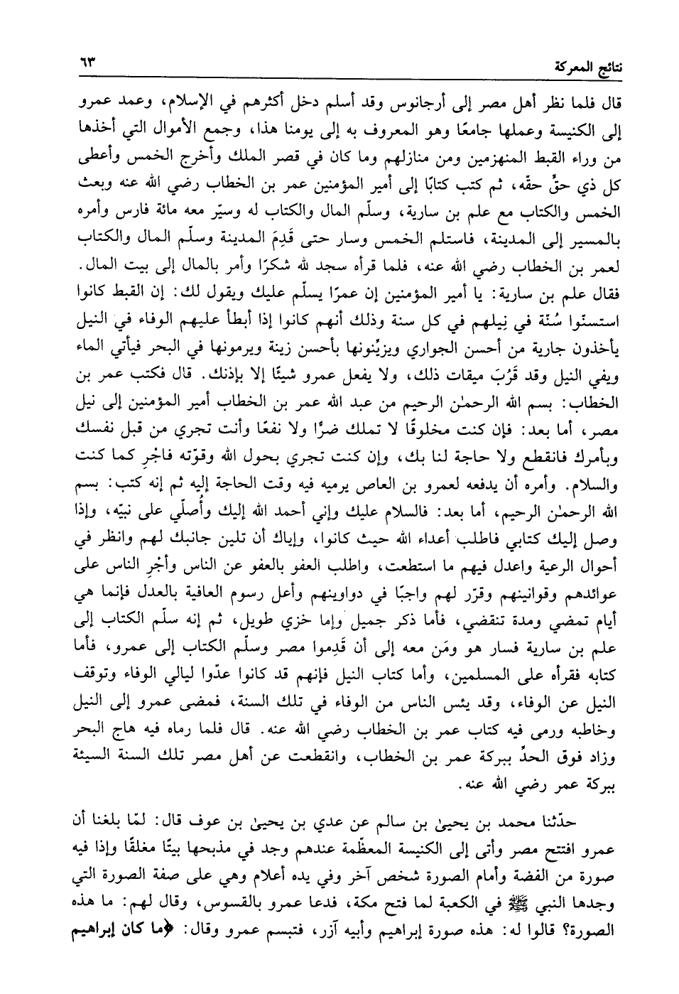 قال: فلما نظر أهل مصر إلى أرجانوس وقد أسلم دخل أكثرهم في الإسلام وعمد عمرو إلى الكنيسة وعملها جامعا وهو المعروف به إلى يومنا هذا وجمع الأموال التي أخذها من وراء القبط المنهزمين ومن منازلهم وما كان في قصر الملك وأخرج الخمس وأعطى كل ذي حق حقه ثم كتب كتابا إلى أمير المؤمنين عمر بن الخطاب رضي الله عليه وبعث الخمس والكتاب مع علم بن سارية وسلم المال والكتاب له وسير معه مائة فارس وأمره بالمسير إلى المدينة فاستلم الخمس وسار حتى قدم المدينة وسلم المال والكتاب لعمر بن الخطاب رضي الله عنه فلما قرأه سجد لله شكرا وأمر بالمال إلى بيت المال فقال علم بن سارية يا أمير المؤمنين أن عمرا يسلم عليك ويقول لك أن القبط كانوا استسنوا سنة في نيلهم في كل سنة وذلك أنهم كانوا إذا أبطأ عليهم الوفاء في النيل يأخذون جارية من أحسن الجواري ويزينونها بأحسن زينة ويرمونها في البحر فيأتي الماء ويفي النيل وقد قرب ميقات ذلك ولا يفعل عمرو شيئا إلا باذنك قال فكتب عمر بن الخطاب بسم الله الرحمن الرحيم من عبد الله عمر بن الخطاب أمير المؤمنين إلى نيل مصر أما بعد فإن كنت مخلوقا لا تملك ضرا ولا نفعا وأنت تجري من قبل نفسك وبأمرك فانقطع ولا حاجة لنا بك وإن كنت تجري بحول الله وقوته فاجر كما كنت والسلام وأمره أن يدفعه لعمرو بن العاص يرميه فيه وقت الحاجة إليه ثم إنه كتب بسم الله الرحمن الرحيم أما بعد فالسلام عليك وانى أحمد الله اليك وأصلي على نبيه وإذا وصل اليك كتابي فأطلب أعداء الله حيث كانوا وإياك أن تلين جانبك لهم وانظر في أحوال الرعية واعدل فيهم ما استطعت وأطلب العفو بالعفو عن الناس وأجر الناس على عوائدهم وقوانينهم وقرر لهم واجبا في دواوينهم وأعل رسوم العافية بالعدل فإنما هي أيام تمضي ومدة تنقضي فإما ذكر جميل واما خزي طويل ثم إنه سلم الكتاب إلى علم بن سارية فسار هو ومن معه إلى أن قدموا مصر وسلم الكتاب إلى عمرو فأما كتابه فقرأه على المسلمين وأما كتاب النيل فإنهم قد كانوا عدوا ليالي الوفاء وتوقف النيل عن الوفاء وقد يئس الناس من الوفاء في تلك السنة فمضى عمرو إلى النيل وخاطبه ورمى فيه كتاب عمر بن الخطاب رضي الله عنه قال فلما رماه فيه هاج البحر وزاد فوق الحد ببركة عمر بن الخطاب وانقطعت عن أهل مصر تلك السنة السيئة ببركة عمر رضي الله عنه.
