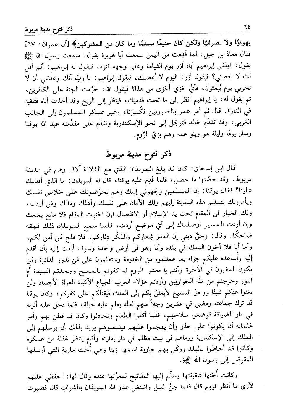 قال ابن اسحق: وكان قد بلغ المربذان الذي مع الثلاثة آلاف وهم في مدينة مريوط وقد حصنها ما حصل فلما قدم عليه يوقنا قال له الموبذان: ما الذي أقدمك علينا فقال يوقنا أن المسلمين وجهوني اليك وهم يحرضونك على خلاص نفسك ويأمرونك بتسليم هذه المدينة إليهم ولك الأمان على نفسك وأهلك ومالك ومن أردت ولك الخيار في المقام تحت يد الإسلام أو الانفصال فإن اخترت المقام فلا مانع يمنعك وإن اردت المسير أوصلناك إلى أي موضع أردت فلما سمع الموبذان ذلك قهقه ضاحكا وقال: وحق ديني أن الغدر شعاركم والمكر دثاركم فلا فلح من آمن لكم وأما أنا فلا أخون الملك في بلده وأنا وهو في أرض واحدة وسوف أبعث إليه بأن أقدم إليه وأساعده عليكم جزاء بما عملتموه من الخديعة وستعلمون على من تدور الدائرة ومن يكون المغبون في الآخرة وأنت يا معشر الروم قد كفرتم بالمسيح وجحدتم السيدة أم النور وخرجتم من ملة الحواريين وأردتم هؤلاء العرب الجياع الاكباد العراة الاجساد ولن يغنوا عنكم شيئا ووحق المسيح لأبعثن بكم إلى الملك فيقتلكم على كفركم وكان يوقنا قد ترك جماعته ومضى في عشرين رجلا منهم لعله يعمل عليه حيلة فلما دخل عليه أنزله في دار الضيافة فوضعوا سلاحهم فلما أكلوا الطعام وتحادثوا وكان قد فطن بهم وأمر غلمانه أن يكونوا على حذر وإن يهجموا عليهم فيقبضوهم يريد بذلك أن يرسلهم إلى الملك إلى الاسكندرية ورماهم في بيت مظلم في دار امارته وأقام ينتظر غفلة من عسكره وكانوا قد أحاطوا بالبلد ووكل بهم جارية اسمها رينا وهي أخت مارية التي أرسلها المقوقس إلى رسول الله صلى الله عليه وسلم.