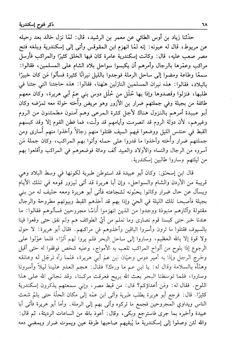 قال ابن اسحق: وكان أبو عبيدة قد استوطن طبرية لكونها في وسط البلاد وهي قريبة من الاردن والشام والسواحل وإن أبا هريرة قد أتى ليزور قومه في تلك الايام ويسأل عن حال ضرار وكانوا يحبونه لشجاعته فأتى أبو هريرة ومعه حليف له من بني بجيلة فأصبحنا تلك الليلة في الحي وإذا بهم قد أخذهم القبط وبيوتهم مطروحة والرجال مقتولة وآثارهم منبوذة ووجدوا من الذين انهزموا أناسا مجروحين فسالوهم فقالوا: ما عندنا خبر حتى كبسنا قوم نصارى وما نعلم من أي الطوائف هم ولم نفق حتى وقعوا فينا بالسيوف فقتلوا ما ترون وأسروا الباقين وأخذوهم في مراكبهم فقال أبو هريرة لا حول ولا قوة إلا بالله العظيم وساروا إلى ساحل البحر فلم يروا لهم أثرا فلما عولوا على الرجوع إذا بلوح من ألواح المراكب تلعب به الامواج وعليه شخص فوقفوا له حتى أقبل وخرج الرجل وإذا به أمير دوس وحيان ابن عم أبي هريرة فلما رآه ترجل له وعانقه وهنأه بالسلامة وقال له: يا ابن عم ما وراءك فقال هجم العدو علينا ليلا وأسرونا وساروا فلما توسطنا البحر بعث الله بريح فغرقت مركبنا وقد نجاني الله على هذا اللوح فقال له: ومن أعداؤكم قال من قبط مصر وإني سمعتهم يذكرون اسكندرية كثيرا قال فرجع أبو هريرة يطلب طبرية وأتى ابن عمه إلى مكان الحلة حتى يلم شعث الناس ويداوي المجروحين فجمع ما تركوه وأتى بهم إلى الرملة وأما أبو هريرة فأتى أبا عبيدة وأخبره بما جرى فاسترجع وبكى وقال أعوذ بالله من الساعات الرديئة ثم قال: والله لئن وصلوا إلى اسكندرية ما يبقيهم صاحبها طرفه عين ويموت ضرار ويمضي دمه.