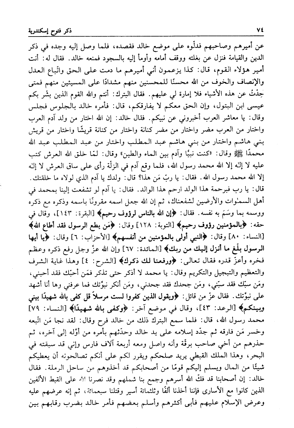 عن أميرهم وصاحبهم فدلوه على موضع خالد فقصده فلما وصل إليه وجده في ذكر الدين والقيامة فنزل عن بغلته ووقف أمامه وأومأ إليه بالسجود فمنعه خالد فقال له: أنت أمير هؤلاء القوم قال كذا يزعمون إني أميرهم ما دمت على الحق واتباع العدل والانصاف والخوف من الله محسنا للمحسنين منهم شدادا على المسيئين منهم فمتى حدت عن هذه الاشياء فلا امارة لي عليهم فقال البترك أنتم والله القوم الذين بشر بكم عيسى ابن البتول وإن الحق معكم لا يفارقكم قال فأمره خالد بالجلوس فجلس وقال: يا معاشر العرب أخبروني عن نبيكم فقال خالد: أن الله اختار من ولد آدم العرب واختار من العرب مضر واختار من مضر كنانة واختار من كنانة قريشا واختار من قريش بني هاشم واختار من بني هاشم عبد المطلب واختار من عبد المطلب عبد الله محمدا صلى الله عليه وسلم وقال: "كنت نبيا وآدم بين الماء والطين" وقال لما خلق الله العرش كتب عليه لا إله إلا الله محمد رسول الله فلما وقع آدم في الزلة رأى على ساق العرش لا إله إلا الله محمد رسول الله فقال: يا رب من هذا قال: ولدك يا آدم الذي لولاه ما خلقتك قال: يا رب فبرحمة هذا الولد ارحم هذا الوالد فقال: يا آدم لو تشفعت الينا بمحمد في أهل السموات والارضين لشفعناك ثم أن الله جعل اسمه مقرونا باسمه وذكره مع ذكره ورسمه بما وسم به نفسه فقال: {إِنَّ اللَّهَ بِالنَّاسِ لَرَؤُوفٌ رَحِيمٌ} [البقرة: 143] وقال في حقه: {بِالْمُؤْمِنِينَ رَؤُوفٌ رَحِيمٌ} [التوبة: 128] وقال: {مَنْ يُطِعِ الرَّسُولَ فَقَدْ أَطَاعَ اللَّهَ} [النساء: 80] وقال: {النَّبِيُّ أَوْلَى بِالْمُؤْمِنِينَ مِنْ أَنْفُسِهِمْ} [الأحزاب: 6] وقال: {يَا أَيُّهَا الرَّسُولُ بَلِّغْ مَا أُنْزِلَ إِلَيْكَ مِنْ رَبِّكَ} [المائدة: 67] وإن الله عز وجل رفع ذكره وعظم فخره وأعز قدره فقال تعالى: {وَرَفَعْنَا لَكَ ذِكْرَكَ} [الشرح:4] وهذا غاية الشرف والتعظيم والتبجيل والتكريم وقال: يا محمد لا أذكر حتى تذكر فمن أحبك فقد أحبني ومن سبك فقد سبني ومن جحدك فقد جحدني ومن أنكر نبؤتك فما عرفني وها أنا أشهد على نبؤتك فقال عز من قائل: {وَيَقُولُ الَّذِينَ كَفَرُوا لَسْتَ مُرْسَلاً قُلْ كَفَى بِاللَّهِ شَهِيداً بَيْنِي وَبَيْنَكُمْ} [الرعد: 43] قال في موضع آخر: {وَكَفَى بِاللَّهِ شَهِيداً} [النساء: 79] محمد رسول الله قال فلما سمع البترك ذلك من خالد فرح وقال لقد نجا من اتبعه وخسر من فارقه ثم جدد إسلامه على يد خالد وحدثهم بأمره من أوله إلى آخره ثم حذرهم من أخي صاحب برقة وإنه واصل ومعه أربعة آلاف فارس وإني قد سبقته في البحر وهذا الملك القبطي يريد صلحكم ويقرر لكم على إنكم تصالحونه أن يعطيكم شيئا من المال ويسلم اليكم قوما من أصحابكم قد أخذوهم من ساحل الرملة فقال خالد: أن أصحابنا قد فك الله أسرهم وجمع بنا شملهم وقد نصرنا الله على القبط الألفين الذين كانوا مع الاسارى فاننا أخذنا ألفا وثلثمائة أسير وقتلنا سبعمائة ثم إنه عرضهم عليه وعرض الإسلام عليهم فأبى أكثرهم وأسلم بعضهم فأمر خالد بضرب رقابهم بين.