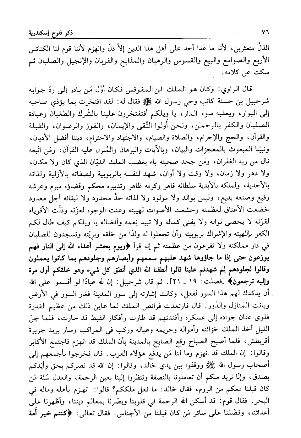 قال الراوي: وكان هو الملك بن المقوقس فكان أول من بادر إلى رد جوابه شرحبيل بن حسنة كاتب وحي رسول الله صلى الله عليه وسلم فقال له: لقد افتخرت بما يؤدي صاحبه إلى البوار ويعقبه سوء الدار يا ويلكم أفتفتخرون علينا بالشرك والطغيان وعبادة الصلبان والكفر بالرحمن ونحن أولو التقى والإيمان والفوز والرضوان والقبلة والقرآن والحج والاحرام والصلاة والصيام والاجتهاد والاحترام ديننا أفضل الاديان ونبينا المبعوث بالمعجزات والبيان وبالآيات والبرهان والمنزل عليه القرآن ومن اتبعه نال من ربه الغفران ومن جحد صحبته باء بغضب الملك الديان الذي كان ولا مكان ولا دهر ولا زمان ولا وقت ولا أوان شهد لنفسه بالربوبية ولصفاته بالأزلية ولذاته بالأحدية ولملكه بالأبدية سلطانه قاهر وكرمه ظاهر وتدبيره محكم وقضاؤه مبرم وعرشه رفيع وصنعه بديع وليس بوالد ولا مولود ولا لذاته حد محدود ولا لبقائه أجل معدود خضعت الأعناق لعظمته وخشعت الاصوات لهيبته وعنت الوجوه لعزته وذلت الاقوياء لقوته لا يحصى نواله ولا يفني كماله ولا تبيد نعمه وافضاله يا ويلكم كيف طاب لكم الكفر بالهيته والاشراك بربوبيته وإن تجعلوا له ولدا من خلقه وبريته وتسجدون للصلبان في دار مملكته ولا تفزعون من عظمته ثم إنه قرأ: {وَيَوْمَ يُحْشَرُ أَعْدَاءُ اللَّهِ إِلَى النَّارِ فَهُمْ يُوزَعُونَ، حَتَّى إِذَا مَا جَاءُوهَا شَهِدَ عَلَيْهِمْ سَمْعُهُمْ وَأَبْصَارُهُمْ وَجُلُودُهُمْ بِمَا كَانُوا يَعْمَلُونَ، وَقَالُوا لِجُلُودِهِمْ لِمَ شَهِدْتُمْ عَلَيْنَا قَالُوا أَنْطَقَنَا اللَّهُ الَّذِي أَنْطَقَ كُلَّ شَيْءٍ وَهُوَ خَلَقَكُمْ أَوَّلَ مَرَّةٍ وَإِلَيْهِ تُرْجَعُونَ} [فصلت: 19, 21] ثم قال شرحبيل أن لله عبادا لو أقسموا على الله أن يدكدك لهم هذا السور لفعل وكانت اشارته إلى سور المدينة فغار السور في الأرض وبانت المنازل والدور قال فارتعدت فرائص الملك لما عاين ذلك من عظيم القدرة فلوى عنان جواده إلى عسكره وأفئدتهم قد طارت وأفكار القبط قد حارت فلما جن الليل أخذ الملك خزائنه وأمواله وحريمه وعياله وركب في المراكب وسار يريد جزيرة أقريطش فلما أصبح الصباح وقع الصايح بالمدينة بأن الملك قد انهزم فاجتمع الأكابر وقالوا: أن الملك قد انهزم وما لنا من يدفع هؤلاء العرب قال: فخرجوا بأجمعهم إلى أصحاب رسول الله صلى الله عليه وسلم ووقفوا بين يدي خالد وقالوا: أن الله قد نصركم بحق وأيدكم بصدق وإنا نريد منكم أن تعاملونا بالنصفة وتنظروا الينا بعين الرحمة والعدل سنة من كان قبلنا معكم من الروم فقال خالد: ما فعل ملككم قالوا: وانهزم بأهله وماله في البحر فقال قوم: قد أسكن الله الرحمة في قلوبنا وبصرنا بمعالم ديننا وأظهرنا على أعدائنا وفضلنا على سائر من كان قبلنا من الأجناس فقال تعالى: {كُنْتُمْ خَيْرَ أُمَّةٍ