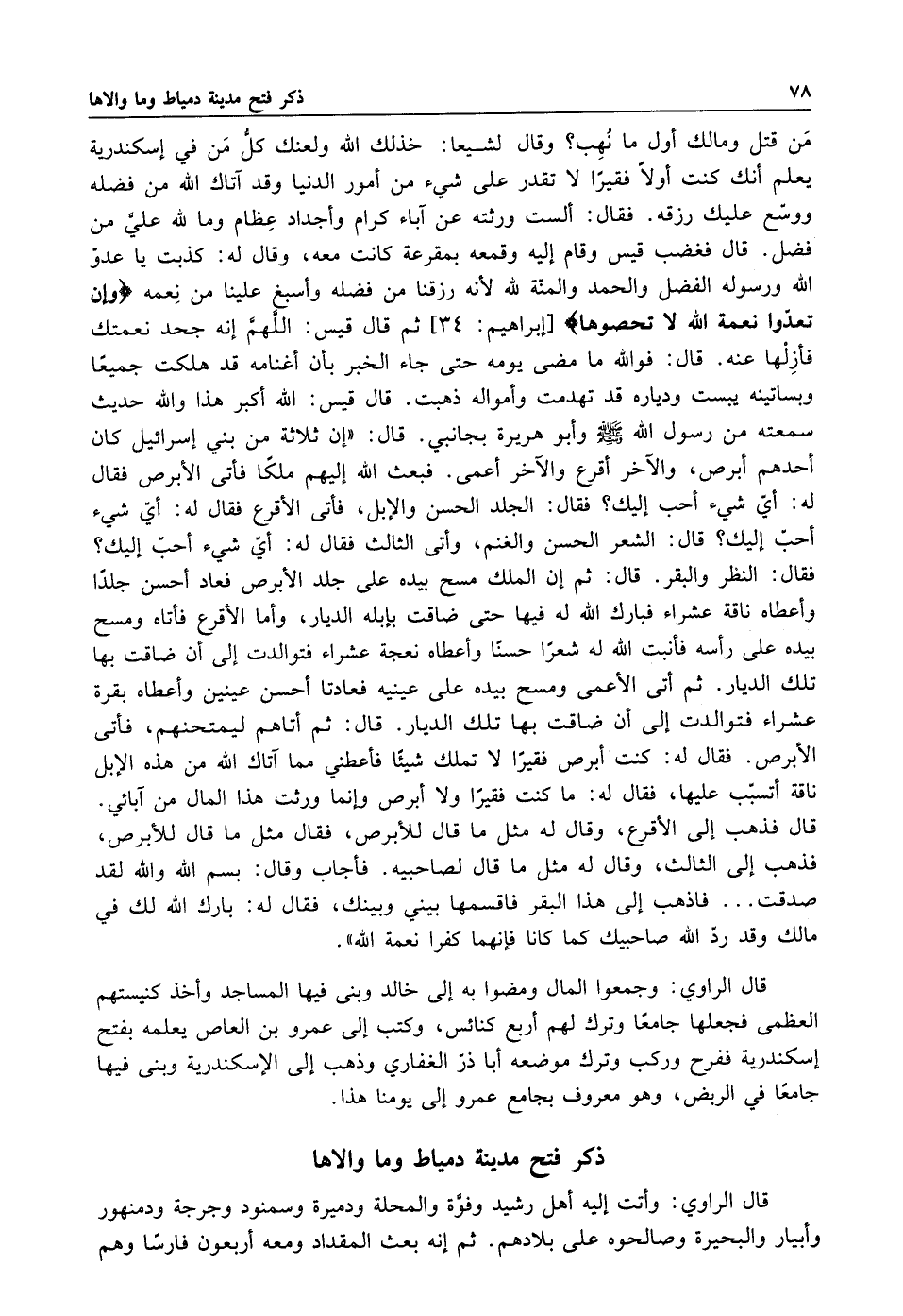 من قتل ومالك أول ما نهب وقال له شيعا: خذلك الله ولعنك كل من في اسكندرية يعلم إنك كنت أولا فقيرا لا تقدر على شيء من أمور الدنيا وقد آتاك الله من فضله ووسع عليك رزقه فقال الست ورثته عن آباء كرام وأجداد عظام وما لله علي من فضل قال فغضب قيس وقام إليه وقمعه بمقرعة كانت معه وقال له: كذبت يا عدو الله ورسوله الفضل والحمد والمنة لله لأنه رزقنا من فضله وأسبغ علينا من نعمه: {وَإِنْ تَعُدُّوا نِعْمَةَ اللَّهِ لا تُحْصُوهَا} [النحل: 18] ثم قال قيس اللهم أنه جحد نعمتك فأزلها عنه قال فوالله ما مضى يومه حتى جاء الخبر بان أغنامه قد هلكت جميعا وبساتينه يبست ودياره قد تهدمت وأمواله ذهبت قال قيس الله أكبر هذا والله حديث سمعته من رسول الله صلى الله عليه وسلم وأبو هريرة بجانبي قال: "أن ثلاثة من بنى اسرائيل كان أحدهم أبرص والآخر أقرع والآخر أعمى فبعث الله إليهم ملكا فأتى الأبرص فقال له: أي شيء أحب اليك فقال الجلد الحسن والابل فأتى الأقرع فقال له: أي شيء أحب اليك قال الشعر الحسن والغنم وأتى الثالث فقال له: أي شيء أحب اليك فقال النظر والبقر قال ثم أن الملك مسح بيده على جلد الأبرص فعاد أحسن جلدا وأعطاه ناقة عشراء فبارك الله له فيها حتى ضاقت بابله الديار وأما الأقرع فأتاه ومسح بيده على رأسه فأنبت الله له شعرا حسنا وأعطاه نعجة عشراء فتوالدت إلى أن ضاقت بها تلك الديار ثم أتى الأعمى ومسح بيده على عينيه فعادتا أحسن عينين وأعطاه بقرة عشراء فتوالدت إلى أن ضاقت بها تلك الديار قال ثم أتاهم ليمتحنهم فأتى الأبرص فقال له: كنت أبرص فقيرا لا تملك شيئا فأعطني مما آتاك الله من هذه الابل ناقة أتسبب عليها فقال له: ما كنت فقيرا ولا أبرص وإنما ورثت هذا المال من آبائي قال فذهب إلى الأقرع وقال له: مثل ما قال للأبرص فقال مثل ما قال الأبرص فذهب إلى الثالث وقال له: مثل ما قال لصاحبيه فاجاب وقال بسم الله والله لقد صدقت فاذهب إلى هذا البقر فاقسمها بيني وبينك فقال له: بارك الله لك في مالك وقد رد الله صاحبيك كما كانا فانهما كفرا نعمة الله".