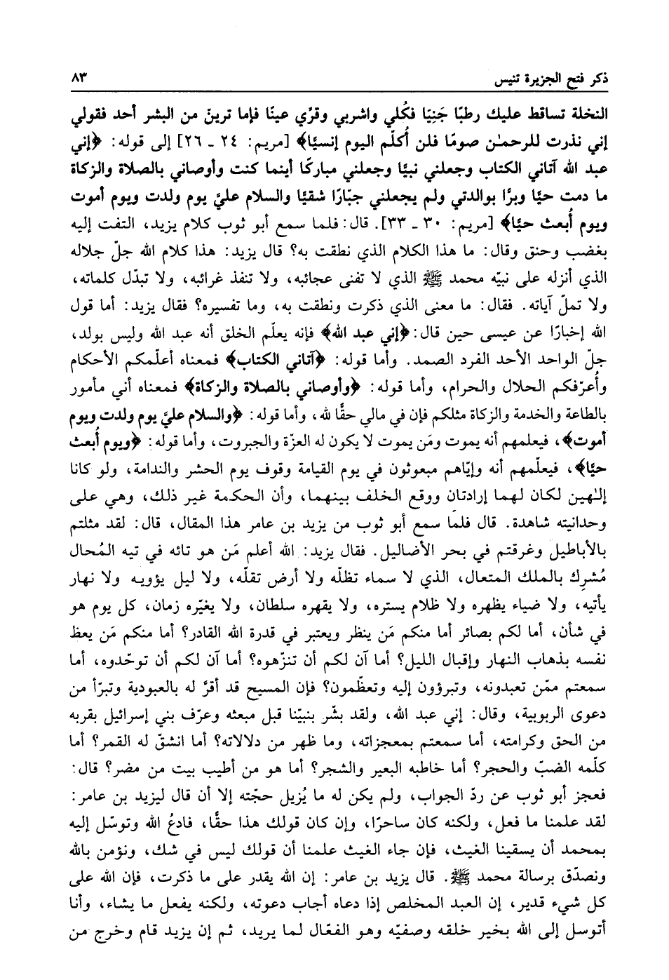 النَّخْلَةِ تُسَاقِطْ عَلَيْكِ رُطَباً جَنِيّاً، فَكُلِي وَاشْرَبِي وَقَرِّي عَيْناً فَإِمَّا تَرَيِنَّ مِنَ الْبَشَرِ أَحَداً فَقُولِي إِنِّي نَذَرْتُ لِلرَّحْمَنِ صَوْماً فَلَنْ أُكَلِّمَ الْيَوْمَ إِنْسِيّاً} [مريم: 24 , 26] إلى قوله: {إِنِّي عَبْدُ اللَّهِ آتَانِيَ الْكِتَابَ وَجَعَلَنِي نَبِيّاً، وَجَعَلَنِي مُبَارَكاً أَيْنَ مَا كُنْتُ وَأَوْصَانِي بِالصَّلاةِ وَالزَّكَاةِ مَا دُمْتُ حَيّاً، وَبَرّاً بِوَالِدَتِي وَلَمْ يَجْعَلْنِي جَبَّاراً شَقِيّاً، وَالسَّلامُ عَلَيَّ يَوْمَ وُلِدْتُ وَيَوْمَ أَمُوتُ وَيَوْمَ أُبْعَثُ حَيّاً} [مريم: 30 , 33] قال فلما سمع أبو ثوب كلام يزيد التفت إليه بغضب وحنق وقال: ما هذا الكلام الذي نطقت به قال يزيد هذا كلام الله جل جلاله الذي أنزله على نبيه محمد صلى الله عليه وسلم الذي لا تفنى عجائبه ولا تنفذ غرائبه ولا تبدل كلماته ولا تمل آياته فقال: ما معنى الذي ذكرت ونطقت به وما تفسيره فقال يزيد أما قول الله اخبارا عن عيسى حين قال: {إِنِّي عَبْدُ اللَّهِ} فإنه يعلم الخلق أنه عبد الله وليس بولد جل الواحد الأحد الفرد الصمد وأما قوله: {آتَانِيَ الْكِتَابَ} فمعناه أعلمكم الاحكام وأعرفكم الحلال والحرام وأما قوله: {وَأَوْصَانِي بِالصَّلاةِ وَالزَّكَاةِ} فمعناه أني مأمور بالطاعة والخدمة والزكاة مثلكم فإن في مالي حقا لله وأما قوله: {وَالسَّلامُ عَلَيَّ يَوْمَ وُلِدْتُ وَيَوْمَ أَمُوتُ} فيعلمهم أنه يموت ومن يموت لا يكون له العزة والجبروت وأما قوله: {وَيَوْمَ أُبْعَثُ حَيّاً} فيعلمهم أنه وإياهم مبعوثون في يوم القيامة وقوف يوم الحشر والندامة ولو كانا الهين لكان لهما ارادتان ووقع الخلف بينهما وإن الحكمة غير ذلك وهي على وحدانيته شاهدة قال فلما سمع أبو ثوب من يزيد بن عامر هذا المقال قال لقد مثلتم بالاباطيل وغرقتم في بحر الاضاليل فقال يزيد الله أعلم من هو تائه في تيه المحال مشرك بالملك المتعال الذي لا سماء تظله ولا أرض تقله ولا ليل يؤويه ولا نهار يأتيه ولا ضياء يظهره ولا ظلام يستره ولا يقهره سلطان ولا يغيره زمان كل يوم هو في شان أما لكم بصائر أما منكم من ينظر ويعتبر في قدرة الله القادر اما منكم من يعظ نفسه بذهاب النهار واقبال الليل اما أن لكم أن تنزهوه أما أن لكم أن توحدوه أما سمعتم ممن تعبدونه وتبرؤن إليه وتعظمونه فإن المسيح قد أقر له بالعبودية وتبرأ من دعوى الربوبية وقال إني عبد الله ولقد بشر بنبينا قبل مبعثه وعرف بني اسرائيل بقربه من الحق وكرامته أما سمعتم بمعجزاته وما ظهر من دلالاته أما انشق له القمر أما كلمه الضب والحجر أما خاطبه البعير والشجر أما هو من أطيب بيت من مصر قال فعجز أبو ثوب عن رد الجواب ولم يكن له ما يزيل حجته إلا أن قال ليزيد بن عامر: لقد علمنا ما فعل ولكنه كان ساحرا وإن كان قولك هذا حقا فادع الله وتوسل إليه بمحمد أن يسقينا الغيث فإن جاء الغيث علمنا أن قولك ليس فيه شك ونؤمن بالله ونصدق برسالة محمد صلى الله عليه وسلم قال يزيد بن عامر أن الله يقدر على ما ذكرت فإن الله على كل شيء قدير أن العبد المخلص إذا دعاه أجاب دعوته ولكنه يفعل ما يشاء وأنا أتوسل إلى الله بخير خلقه وصفيه وهو الفعال لما يريد ثم أن يزيد قام وخرج من.