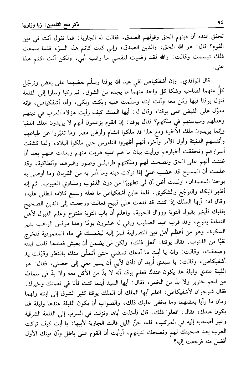 قال الواقدي: وإن اشفكياص لقي عبد الله يوقنا وسلم بعضهما على بعض وترجل كل منهما لصاحبه وشكا كل واحد منهما ما يجده من الشوق ثم ركبا وسارا إلى القلعة فنزل يوقنا فيها ومن معه وأتت ابنته وسلمت عليه وبكت وبكى وأما اشفكياص فإنه معول على القبض على يوقنا وقال له: أيها الملك كيف رأيت هؤلاء العرب في دينهم وعدلهم وسياستهم في ملكهم فقال يوقنا أن القوم يزعمون أنهم لا يريدون ملك الدنيا وإنما يريدون ملك الآخرة ومع هذا قد ملكوا الشام وأرض مصر وما تغيروا عن طباعهم وأنفسهم الدنيئة وأول الأمر وآخره أنهم أظهروا الناموس حتى ملكوا البلاد ولما كشفت أسرارهم وتحقق أخبارهم ورأيت بيان ما هم عليه هربت منهم وبعدت عنهم بعد أن ظننت أنهم على الحق ونصحت لهم وملكتهم طرابلس وصور وغيرهما وانطاكية وقد علمت أن المسيح قد غضب علي إذ تركت دينه وما أمر به من القربان وما أوصى به يوحنا المعمدان ولست اظن أن لي تطهيرا من دون الذنوب ومساوي العيوب ثم إنه أظهر البكاء والتوجع والشكوى فلما عاين اشفكياص ما فعله وسمع كلامه انطلى عليه وقال له: ايها الملك إذا كنت قد ندمت على قبيح فعالك ورجعت إلى الدين الصحيح بقلبك فابشر بقبول التوبة وزوال الحوبة واعلم أن باب التوبة مفتوح وعلم القبول لأهل الندامة يلوح وقد قرب عيد الصليب وبقي له عشرون يوما وهذا مرقس الراهب بدير السكرة وهو من أعظم أهل دين النصرانية فسر إليه ليغمسك في ماء المعمودية فتخرج نقيا من الذنوب فقال يوقنا أفعل ذلك ولكن من يضمن أن يعيش فعندها قامت ابنته وصقعت وقالت والله يا أبت ما أدعك تمضي حتى أتملى منك بالنظر وقبلت يد أشفكياص وقالت يا سيدي أريد أن تأذن لأبي أن يسير معي إلى حصني فقال هو الليلة عندي وليلة غد يكون عندك فعلم يوقنا أنه لا بد من الاكل معه ولا بد في سماطه من لحم خنزير ولا بد من الخمر فقال: أيها السيد أينما كنت فأنا في نعمتك وخيرك فقال شوجوان لاشفيكاص اعلم أيها الملك أن الملك يوقنا كثير الشوق إلى ابنته ولهما زمان ما رأيا بعضهما وما يخفى عليك ذلك والصواب أن يكون الليلة عندها وليلة غد يكون عندك فقال افعلوا ذلك قال فأخذت أباها ونزلت في السرب إلى القلعة الشرقية وعبر أصحابه إليه في المركب فلما جن الليل قالت الجارية لأبيها يا أبت كيف تركت العرب بعد صحبتك لهم ونصحك لدينهم أرأيت أن القوم على باطل وإن دينك الاول أفضل منه فرجعت إليه.