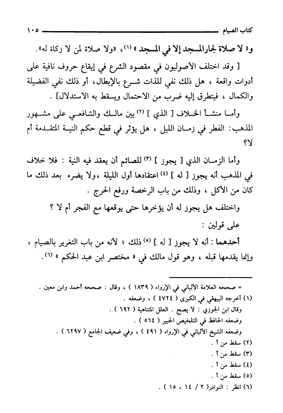 [وقد اختلف الأصوليون في مقصود الشرع في إيقاع حروف نافية على أدوات واقعة، هل ذلك نفي للذات شرع بالإبطال، أو ذلك نفي الفضيلة والكمال، فيتطرق إليه ضرب من الاحتمال ويسقط به الاستدلال].