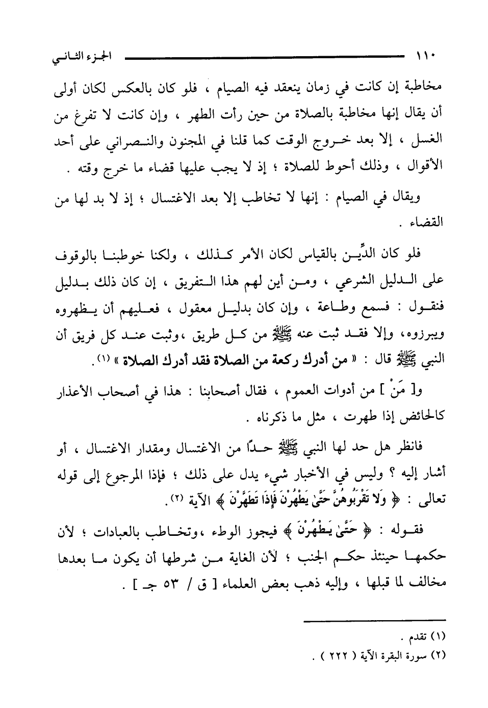 فانظر هل حد لها النبي - صلى الله عليه وسلم - حدًا من الاغتسال ومقدار الاغتسال، أو أشار إليه؟ وليس في الأخبار شيء يدل على ذلك؛ فإذا المرجوع إلى قوله تعالى: {وَلَا تَقْرَبُوهُنَّ حَتَّى يَطْهُرْنَ فَإِذَا تَطَهَّرْنَ} الآية (¬2).