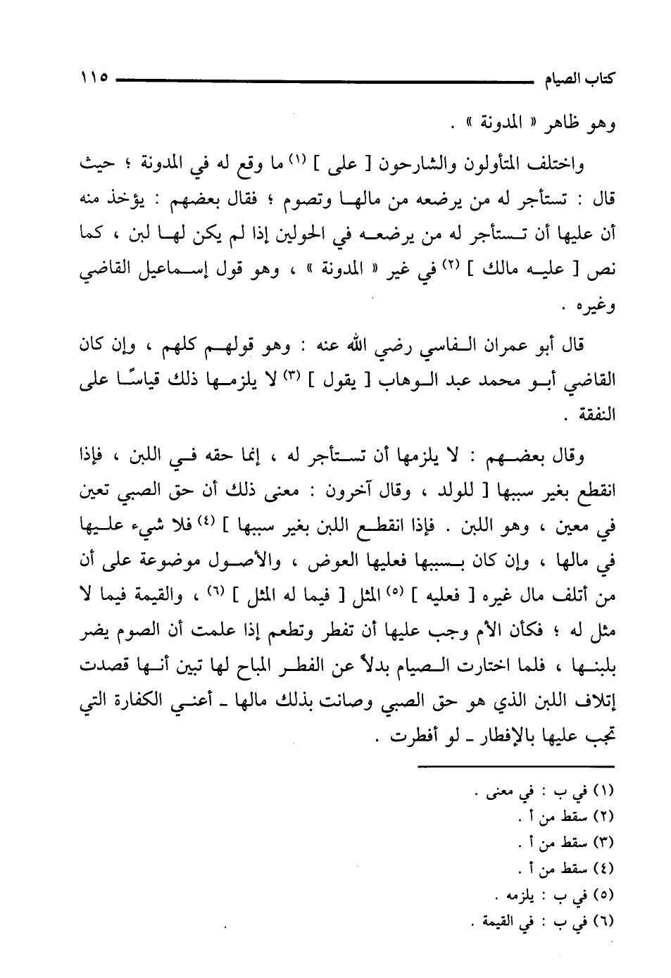 وقال بعضهم: لا يلزمها أن تستأجر له، إنما حقه في اللبن، فإذا انقطع بغير سببها [للولد، وقال آخرون: معنى ذلك أن حق الصبي تعين في معين، وهو اللبن. فإذا انقطع اللبن بغير سببها] (¬4) فلا شيء عليها في مالها، وإن كان بسببها فعليها العوض، والأصول موضوعة على أن من أتلف مال غيره [فعليه] (¬5) المثل [فيما له المثل] (¬6)، والقيمة فيما لا مثل له؛ فكأن الأم وجب عليها أن تفطر وتطعم إذا علمت أن الصوم يضر بلبنها، فلما اختارت الصيام بدلًا عن الفطر المباح لها تبين أنها قصدت إتلاف اللبن الذي هو حق الصبي وصانت بذلك مالها -أعني الكفارة التي تجب عليها بالإفطار- لو أفطرت.