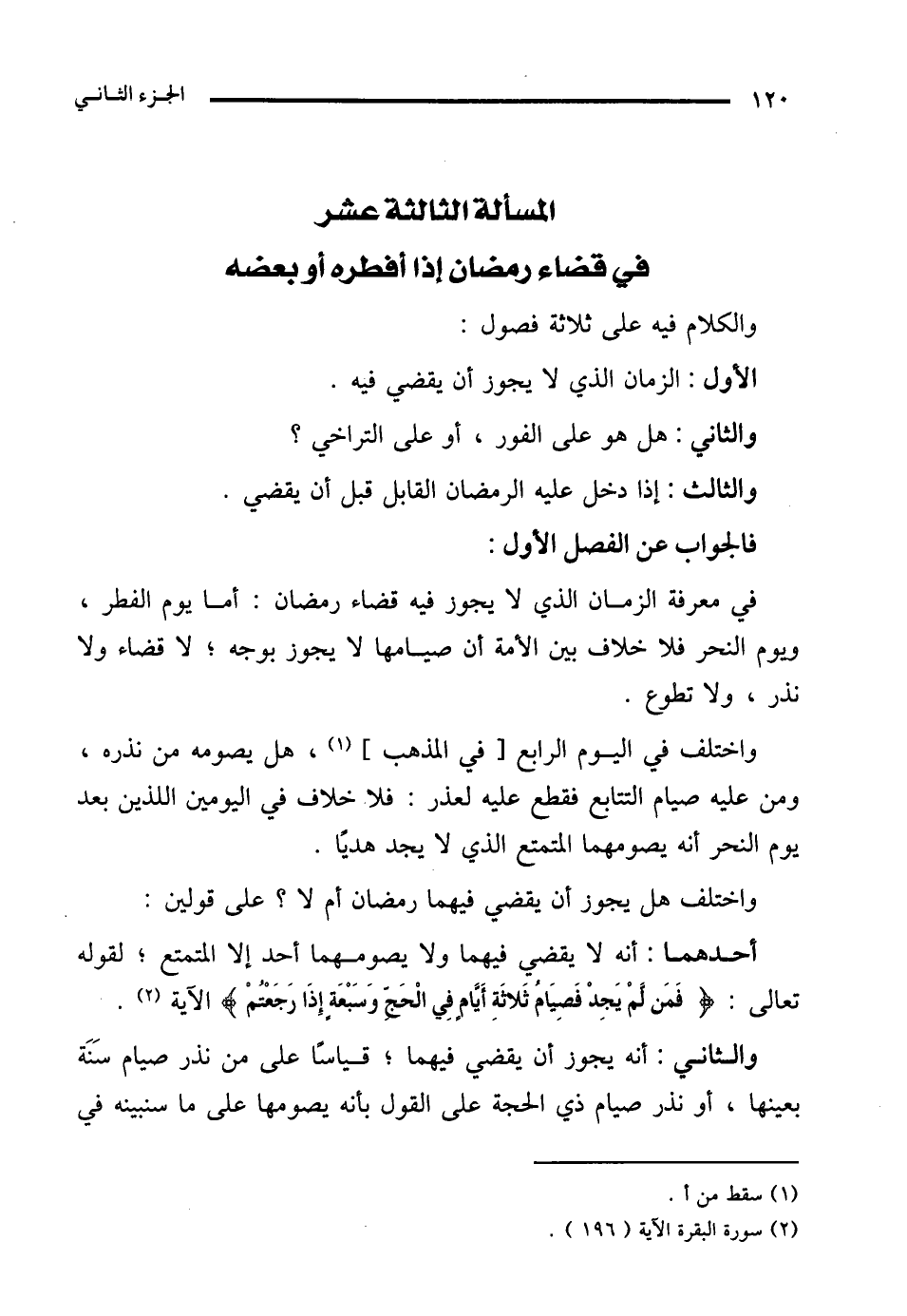 المسألة الثالثة عشر في قضاء رمضان إذا أفطره أو بعضه