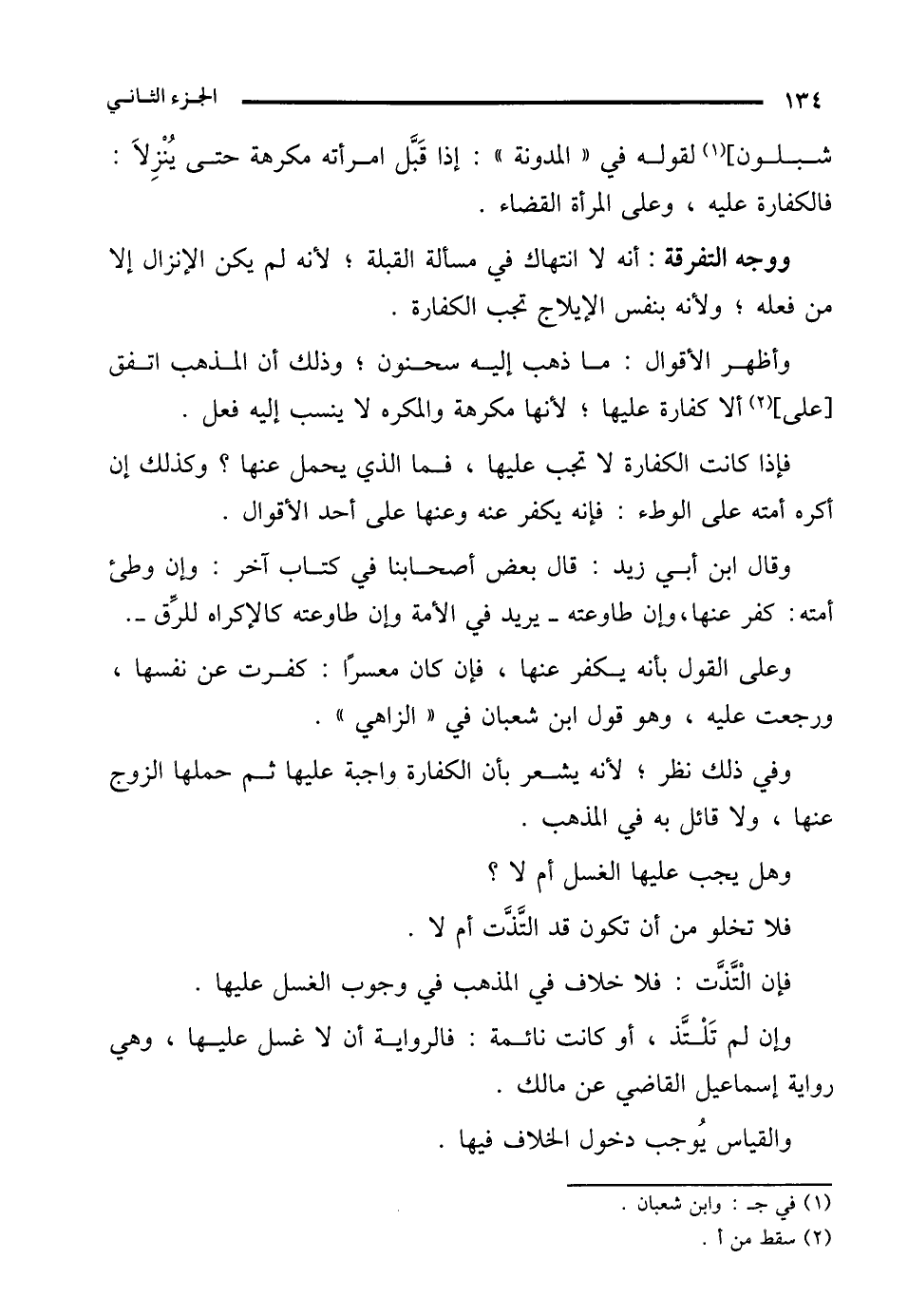 شبلون] (¬1) لقوله في "المدونة": إذا قَبَّل امرأته مكرهة حتى يُنْزِلَا: فالكفارة عليه، وعلى المرأة القضاء.
