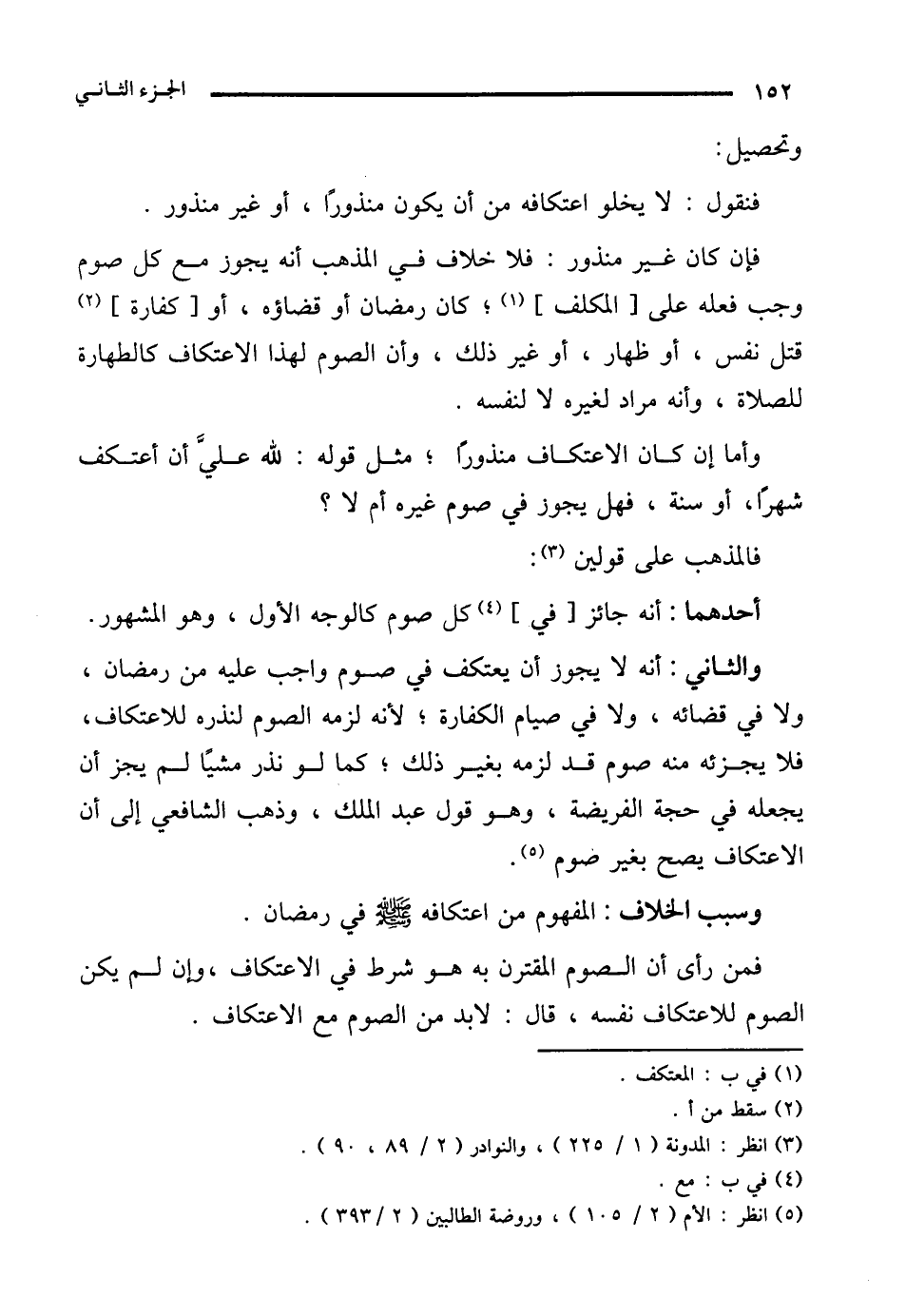 والثاني: أنه لا يجوز أن يعتكف في صوم واجب عليه من رمضان، ولا في قضائه، ولا في صيام الكفارة؛ لأنه لزمه الصوم لنذره للاعتكاف، فلا يجزئه منه صوم قد لزمه بغير ذلك؛ كما لو نذر مشيًا لم يجز أن يجعله في حجة الفريضة، وهو قول عبد الملك، وذهب الشافعي إلى أن الاعتكاف يصح بغير صوم (¬5).