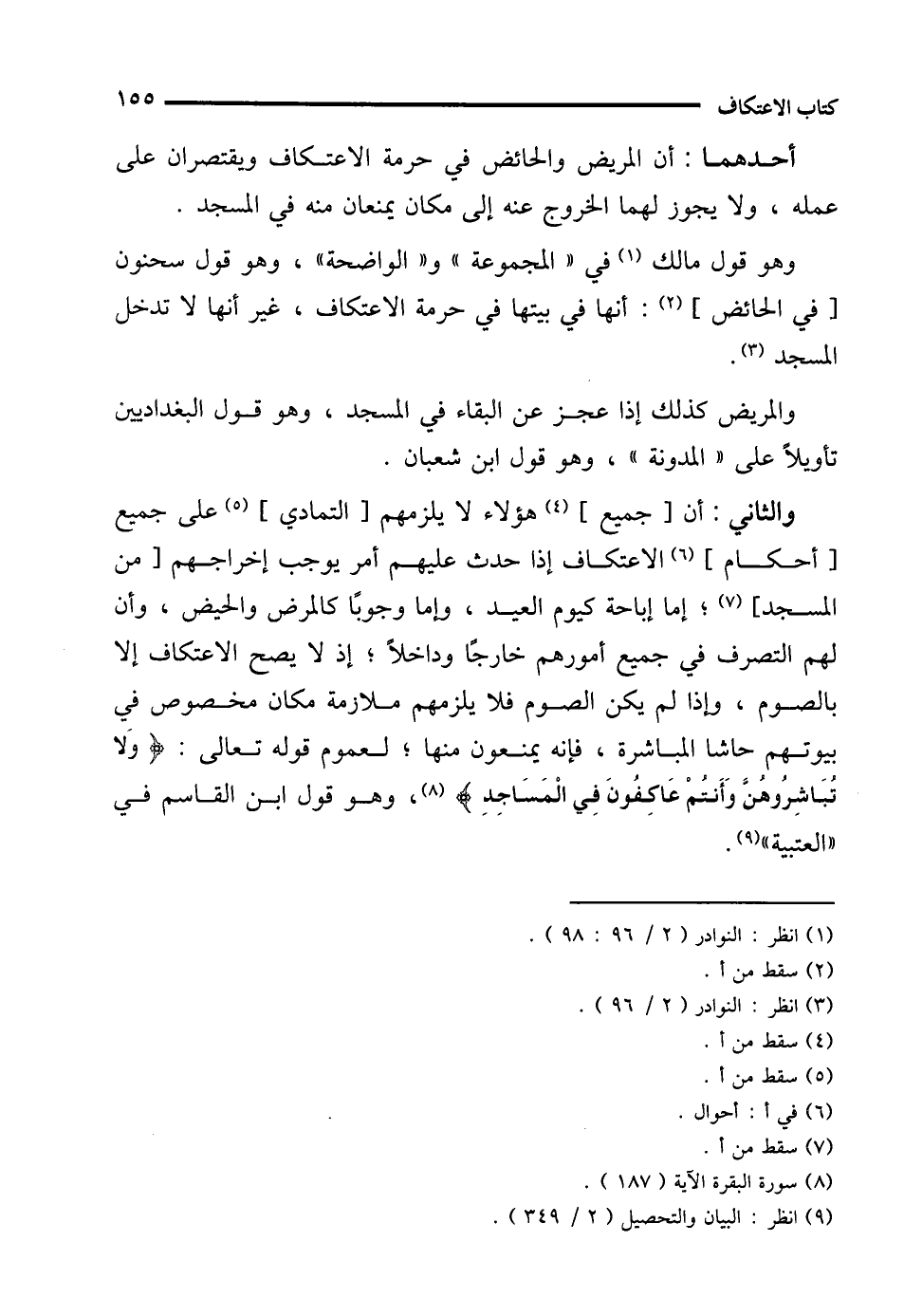 والثاني: أن [جميع] (¬4) هؤلاء لا يلزمهم [التمادي] (¬5) على جميع [أحكام] (¬6) الاعتكاف إذا حدث عليهم أمر يوجب إخراجهم [من المسجد] (¬7)؛ إما إباحة كيوم العيد، وإما وجوبًا كالمرض والحيض، وأن لهم التصرف في جميع أمورهم خارجًا وداخلًا؛ إذ لا يصح الاعتكاف إلا بالصوم، وإذا لم يكن الصوم فلا يلزمهم ملازمة مكان مخصوص في بيوتهم حاشا المباشرة، فإنه يمنعون منها؛ لعموم قوله تعالى: {وَلَا تُبَاشِرُوهُنَّ وَأَنْتُمْ عَاكِفُونَ فِي الْمَسَاجِدِ} (¬8)، وهو قول ابن القاسم في "العتبية" (¬9).
