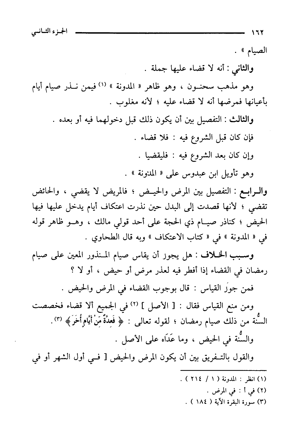 والرابع: التفصيل بين المرض والحيض؛ فالمريض لا يقضي، والحائض تقضي؛ لأنها قصدت إلى البدل حين نذرت اعتكاف أيام يدخل عليها فيها الحيض؛ كناذر صيام ذي الحجة على أحد قولي مالك، وهو ظاهر قوله في "المدونة" في "كتاب الاعتكاف" وبه قال الطحاوي.