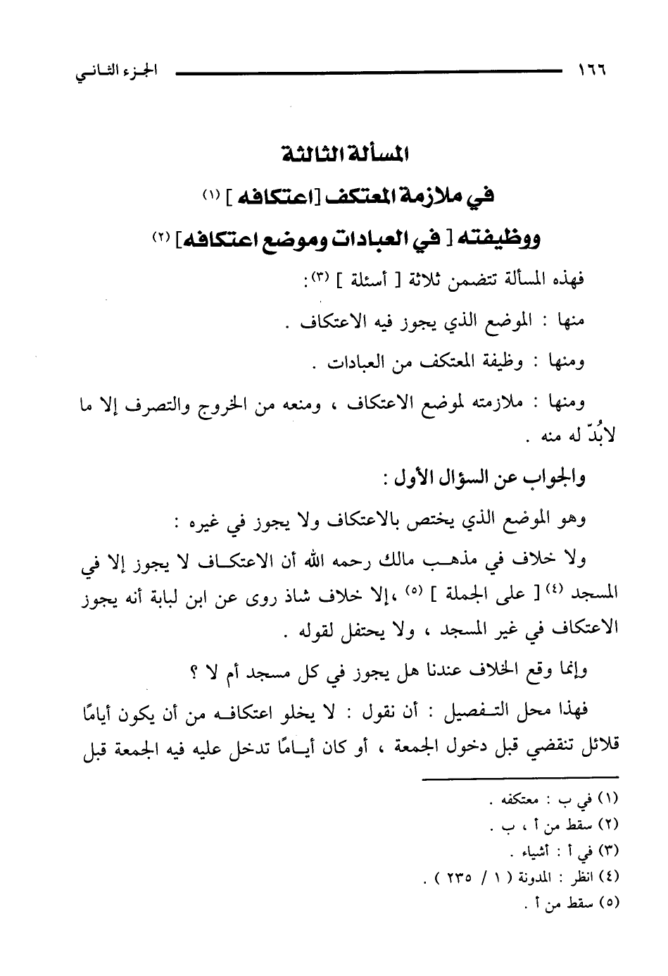 المسألة الثالثة في ملازمة المعتكف [اعتكافه] (¬1) ووظيفته [في العبادات وموضع اعتكافه] (¬2)