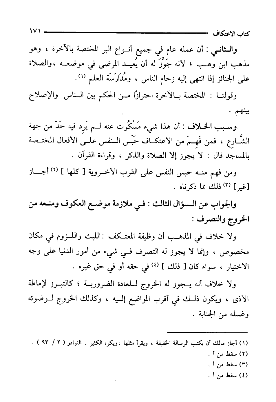 والثاني: أن عمله عام في جميع أنواع البر المختصة بالآخرة، وهو مذهب ابن وهب؛ لأنه جوَّزَ له أن يُعيد المرضى في موضعه، والصلاة على الجنائز إذا انتهى إليه زحام الناس، ومُدَارَسَة العلم (¬1).