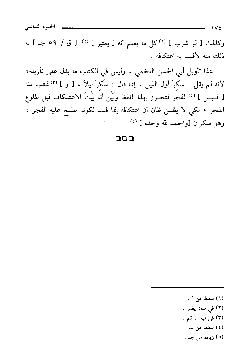 هذا تأويل أبي الحسن اللخمي، وليس في الكتاب ما يدل على تأويله؛ لأنه لم يقل: سَكِرَ أول الليل، إنما قال: سكِرَ ليلًا، [و] (¬3) ذهب منه [قبل] (¬4) الفجر فتحرز بهذا اللفظ وبَيَّن أنه بَيَّتَ الاعتكاف قبل طلوع الفجر؛ لكي لا يظن ظان أن اعتكافه إنما فسد لكونه طلع عليه الفجر، وهو سكران [والحمد لله وحده] (¬5).