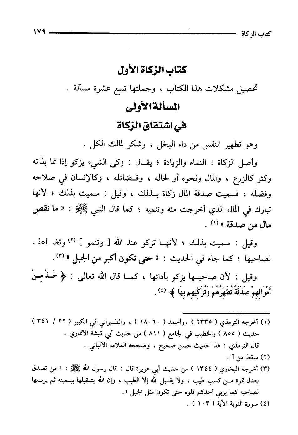 وأصل الزكاة: النماء والزيادة؛ يقال: زكى الشيء يزكو إذا نما بذاته وكثر كالزرع، والمال ونحوه أو لحاله، وفضائله، وكالإنسان في صلاحه وفضله، فسميت صدقة المال زكاة بذلك، وقيل: سميت بذلك؛ لأنها تبارك في المال الذي أخرجت منه وتنميه؛ كما قال النبي - صلى الله عليه وسلم -: "ما نقص مال من صدقة" (¬1).